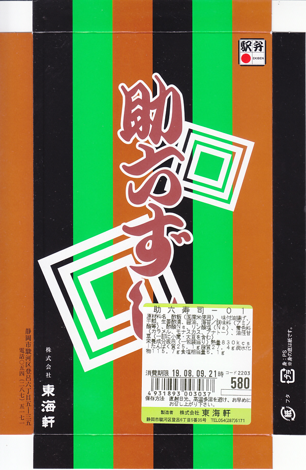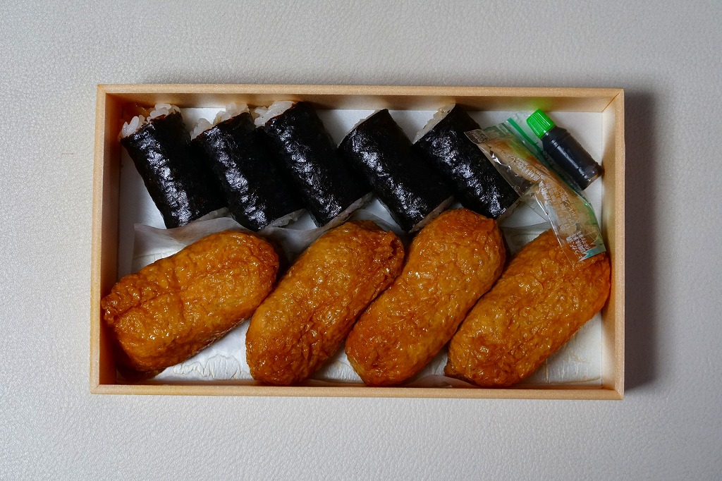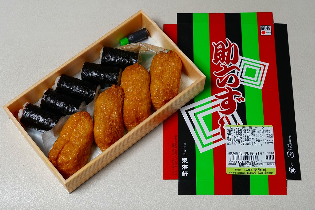 静岡駅で昔から売られているであろう、助六寿司の駅弁。浅い折箱に細身のいなりずし4個と、かんぴょうの細巻き5個を並べ、ガリの袋と醤油のボトルを添付するだけ。味も没個性。ふたの絵柄を含めて見栄えを飾らない、豊橋駅や草津駅や伊東駅など、東海道エリアで時に話題となる稲荷寿司駅弁と違い、まったく話題に上がらない、そんな惰性に感心させられる。価格は2018年時点で550円、2019年2月から580円、2022年4月から650円、2025年4月から720円。