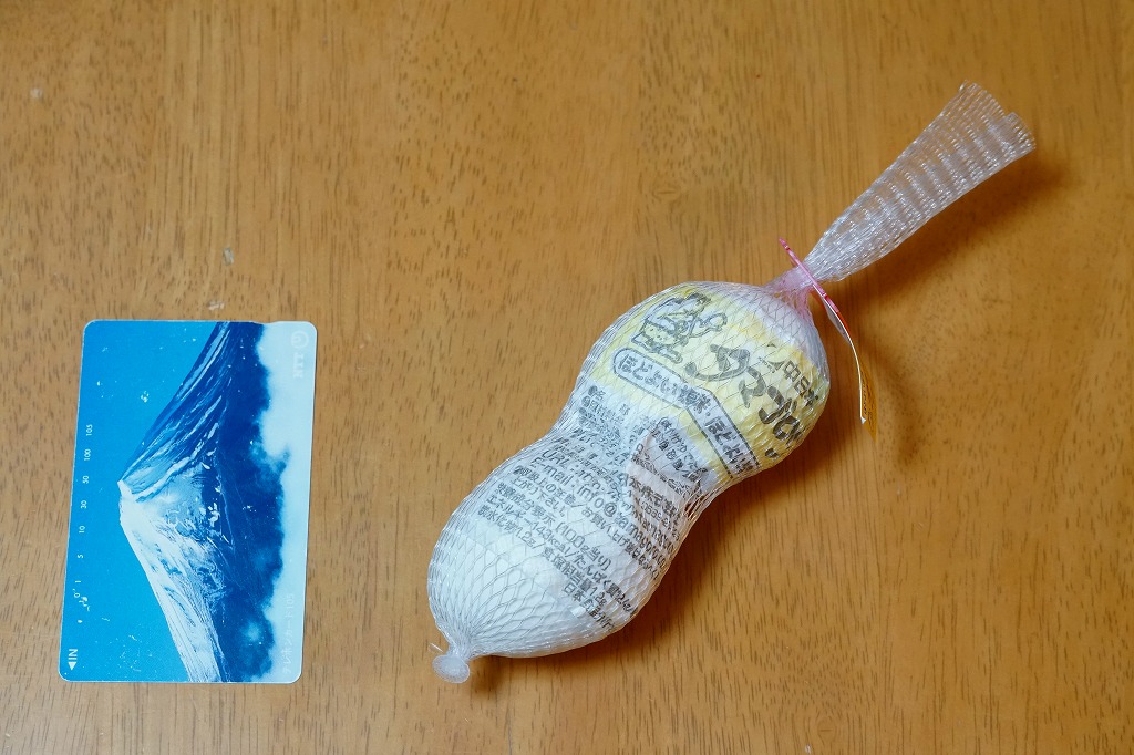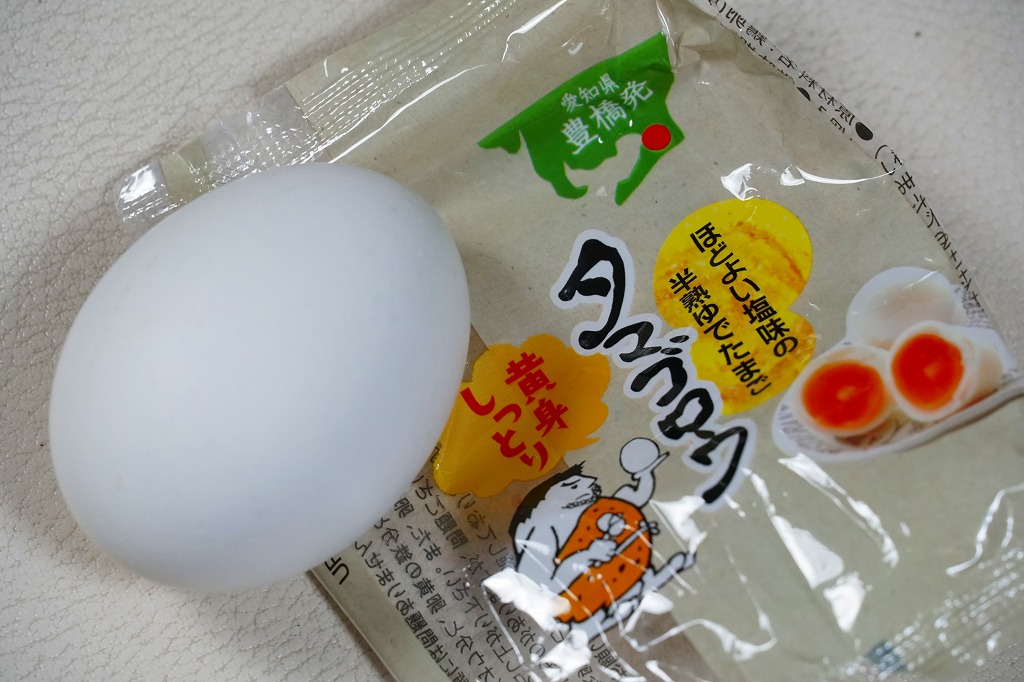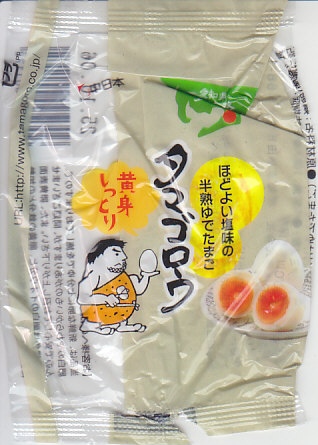 上記の商品「タマゴロウ」の、1個入りパッケージ。味付ゆで卵を1個だけ袋詰めして、商品名や食品表示などはその袋に印刷して、紙は添付しない。中身は同じ。東のマジックパールと、西のタマゴロウの国境線は、どこにあるのだろうか。
