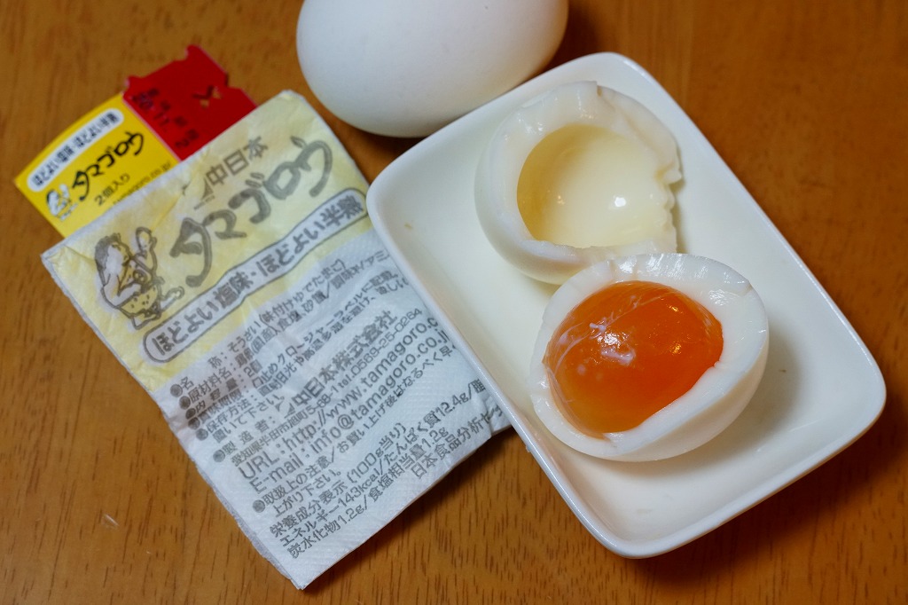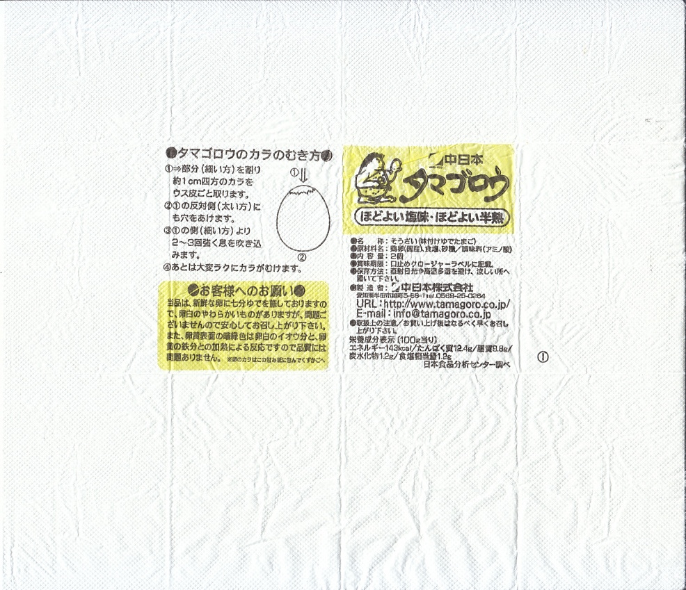 東海地方や西日本のキヨスクやコンビニなどで売られる、愛知県の味付けゆで卵で、昭和50年代の発売。その存在は、東日本の「マジックパール・カル」に相当するものだろう。静岡駅の駅弁売店で買った今回のものは、塩味が付いたゆで卵を2個、プラ製のネットに収めたもの。紙箱入りや1個入りのものもある模様。私が食べ慣れたマジックパールより、ざらついた感じを受けた。添付の包み紙に記される「タマゴロウのカラのむき方」の内容が独特。