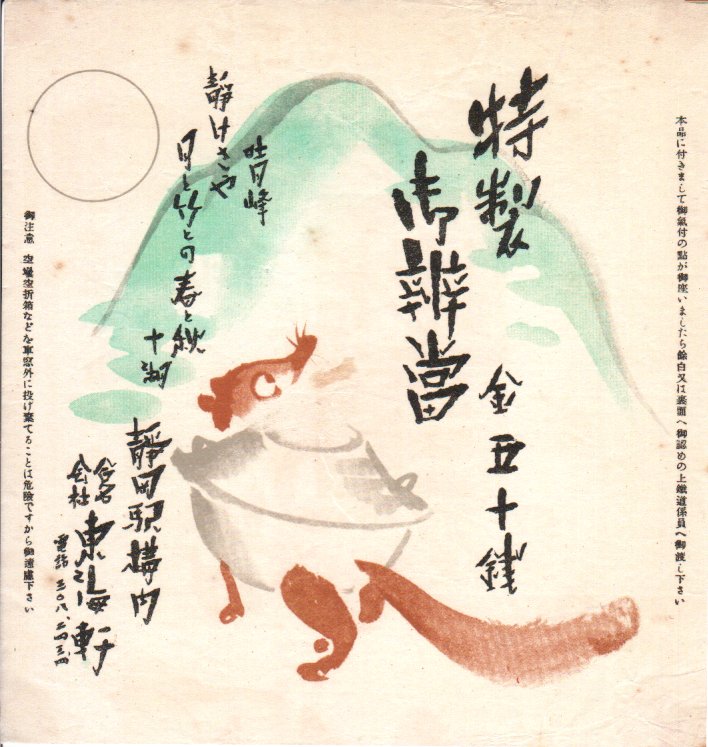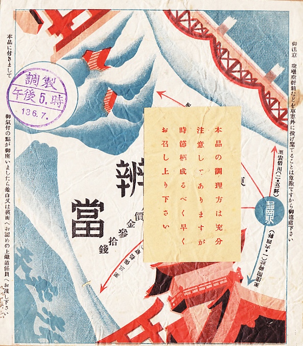 1938(昭和13)年6月7日17時の調製と思われる、昔の静岡駅弁の掛紙。絵柄は下記の1935年5月のものと同じ。絵柄を注意書きの紙片で隠したのは、1932年6月のものと同じ。