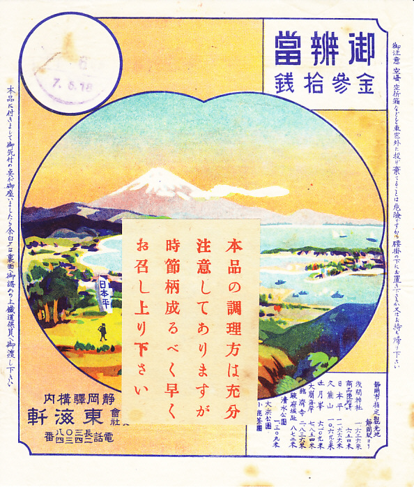 1932(昭和7)年6月18日の調製と思われる、昔の静岡駅弁の掛紙。日本平から駿河湾や清水港越しに眺める三保の松原や富士山を描いたのに、注意書きの紙片を貼り付けてこれを隠してしまった。現代も食品表示ラベルが駅弁掛紙の絵柄を隠すことがあるので、約90年前も同じなんだなと思う。