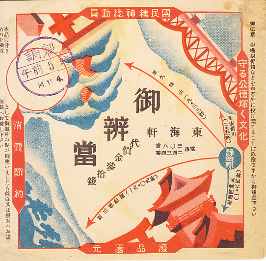 1939(昭和14)年11月4日17時の調製と思われる、昔の静岡駅弁の掛紙。絵柄は下記の1938年6月のものと同じだが、サイズが小さくなり、四隅に「國民精神總動員」「守る公梛Pく文化」「廢品還元」「消費節約」と、戦時を思わせる標語が追加された。