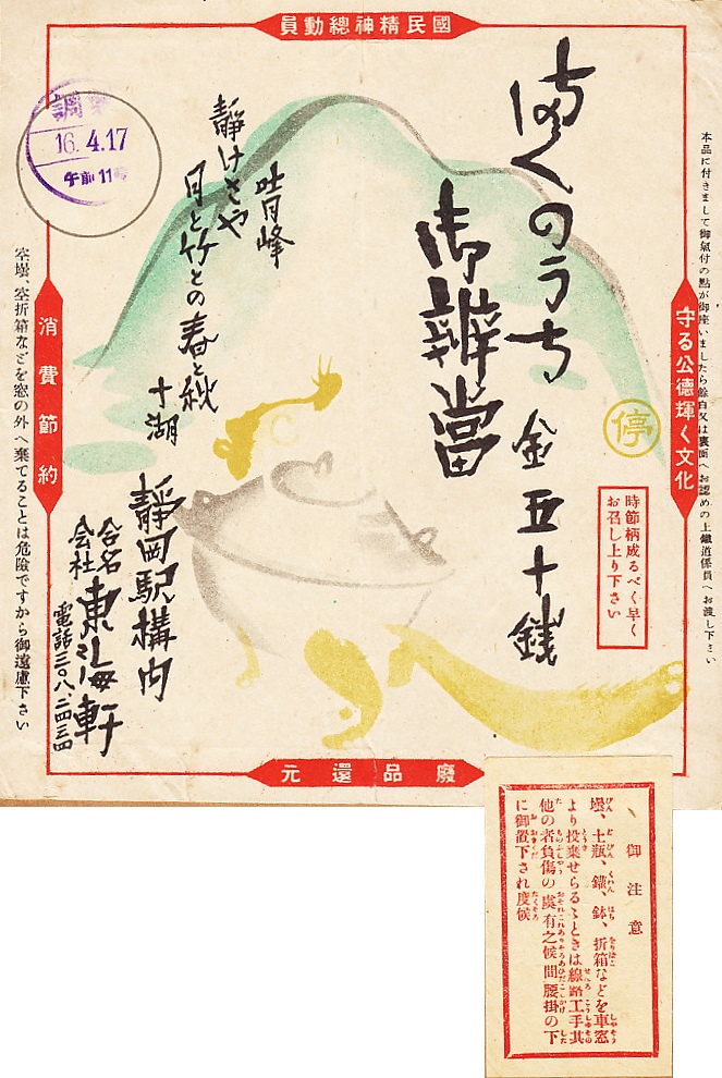 1941(昭和16)年4月17日11時の調製と思われる、昔の静岡駅弁の掛紙。下記の1940年頃の特製御辨當(50銭)と、同じ絵柄と価格を持ち、名前が異なる。1939(昭和14)年9月の価格等統制令に基づく価格停止品を示すマル停マークが付き、四隅に「國民精神總動員」「守る公梛Pく文化」「廢品還元」「消費節約」を加え、平時から戦時に変わったことを示す。