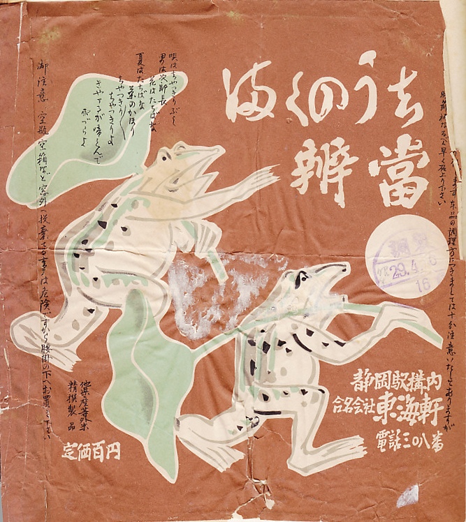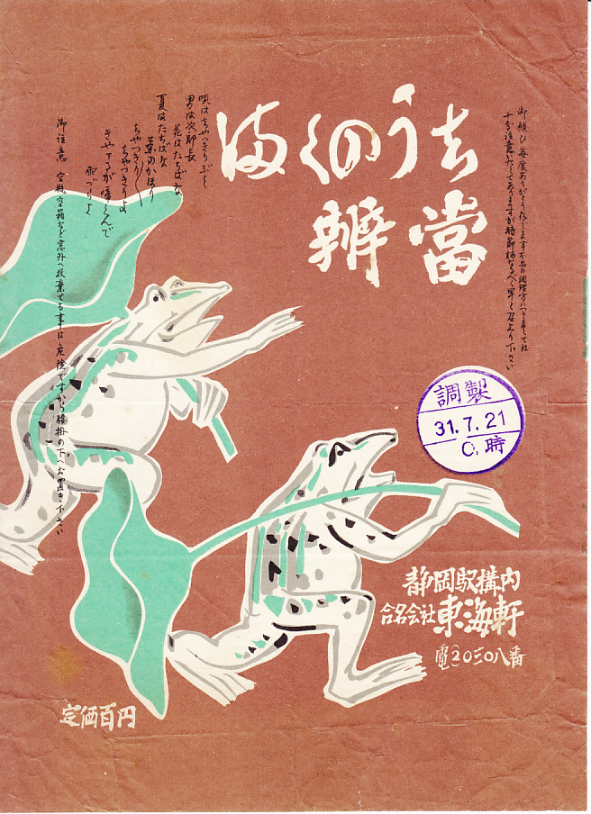 1956(昭和31)年7月21日0時の調製と思われる、昔の静岡駅弁の掛紙。フキの葉を持ったカエルが練り歩き、唄はちゃっきり節 男は次郎長、と続く「ちゃっきり節」の歌詞を記す。1927(昭和2)年に当時の静岡鉄道電気が開園した狐ヶ崎遊園地のCMソングであり、北原白秋作詞の民謡。