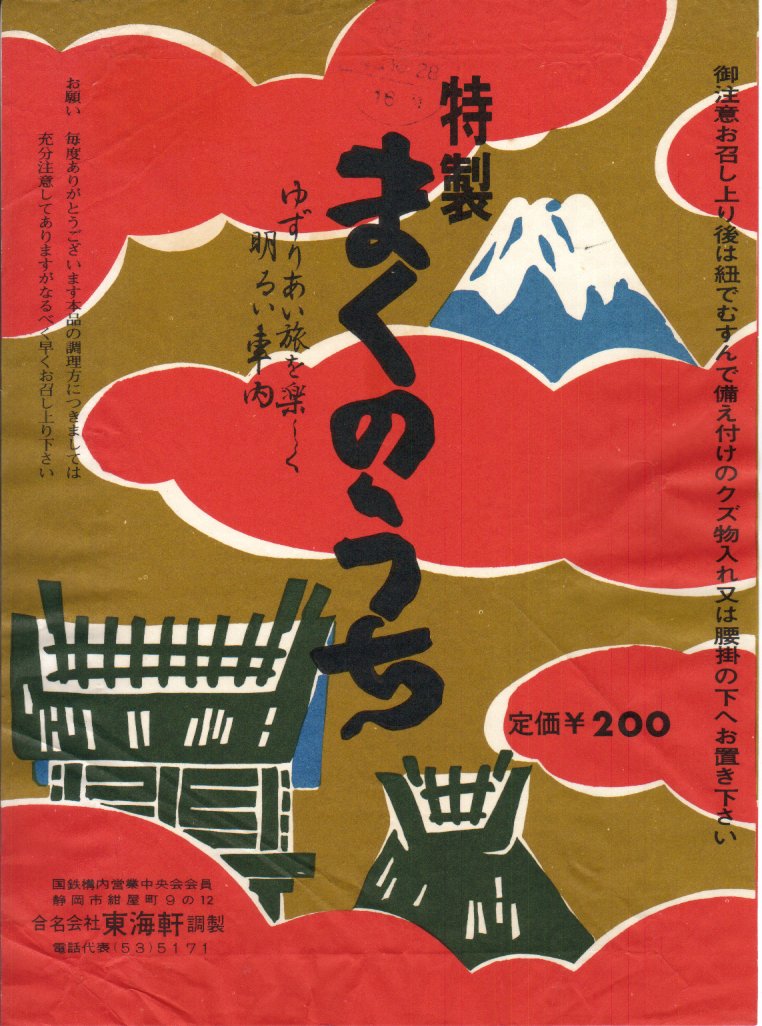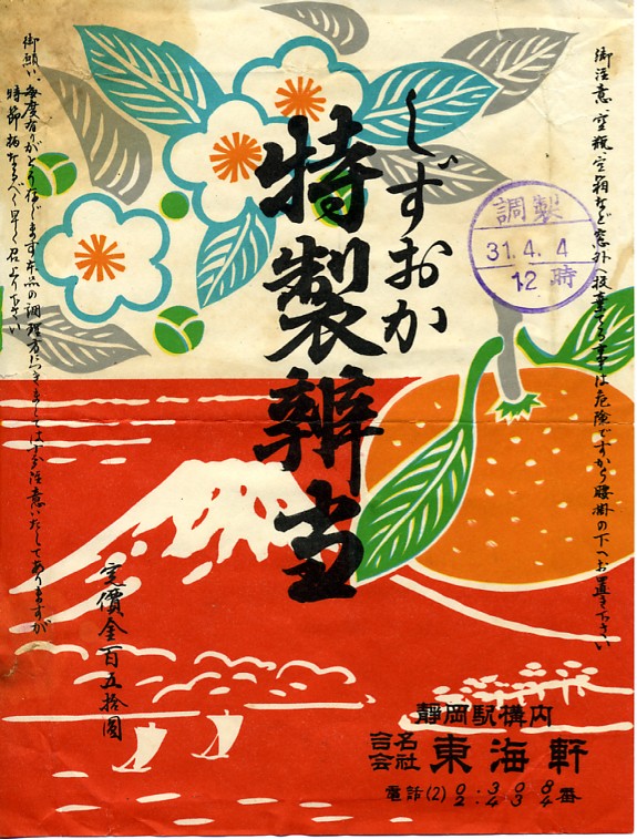 1956(昭和31)年4月4日12時の調製と思われる、昔の静岡駅弁の掛紙。富士とミカンなどを描く。幕の内駅弁の相場が100円だった時代に、150円も取る文字通りの特製弁当だったのだろう、御飯とおかずのそれぞれに掛紙が付いていたと思われる。