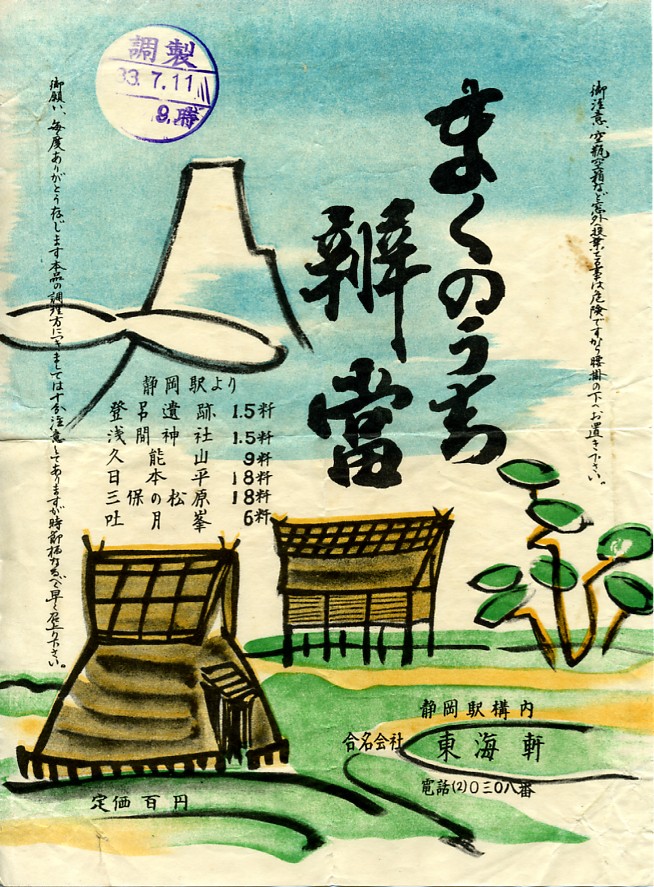 1958(昭和33)年7月11日9時の調製と思われる、昔の静岡駅弁の掛紙。昔も今も静岡を代表する観光名所の富士と、当時の静岡を代表する観光名所であった登呂遺跡を描く。
