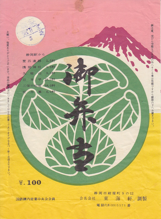 1964(昭和39)年8月3日(月)16時の調製と思われる、昔の静岡駅弁の掛紙。絵柄は下記のものと同じ、富士と波浪の画。調製元の電話番号が変わった。