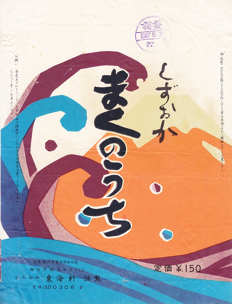 1963(昭和38)年8月31日(土)22時の調製と思われる、昔の静岡駅弁の掛紙。波浪と富士山を描く、普通の駅弁のための普通の掛紙。