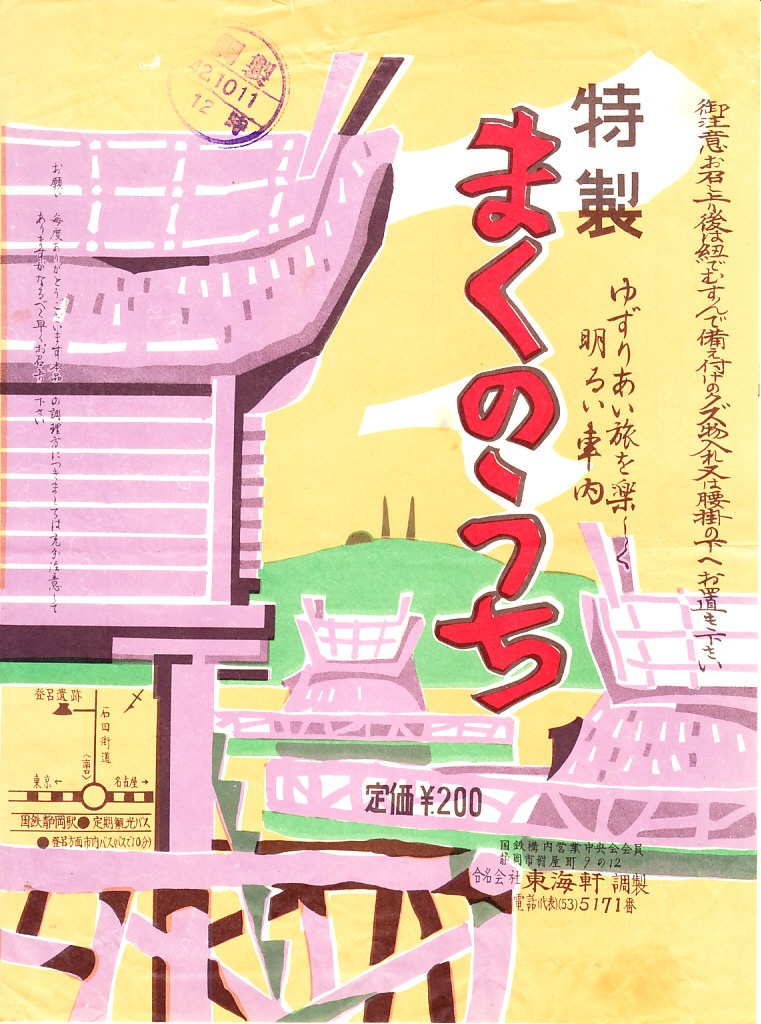 1967(昭和42)年10月11日(水)12時の調製と思われる、昔の静岡駅弁の掛紙。この古代の建物の絵柄は、案内図から登呂遺跡のものだとわかる。背景は日本平の電波塔だろうか。それならば古代と現代が融合する。