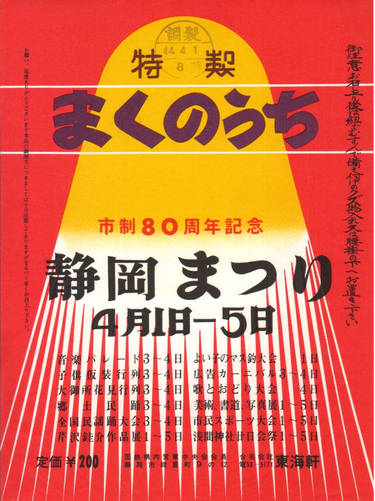 1969(昭和44)年4月1日(火)8時の調製と思われる、昔の静岡駅弁の掛紙。静岡市政80周年記念「静岡まつり」の記念掛紙で、そのためか調製印がベストポジションに押されていると思う。
