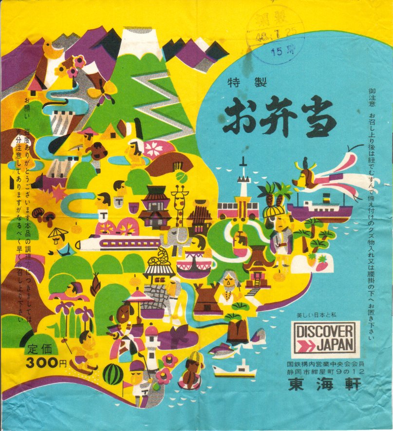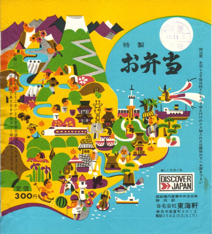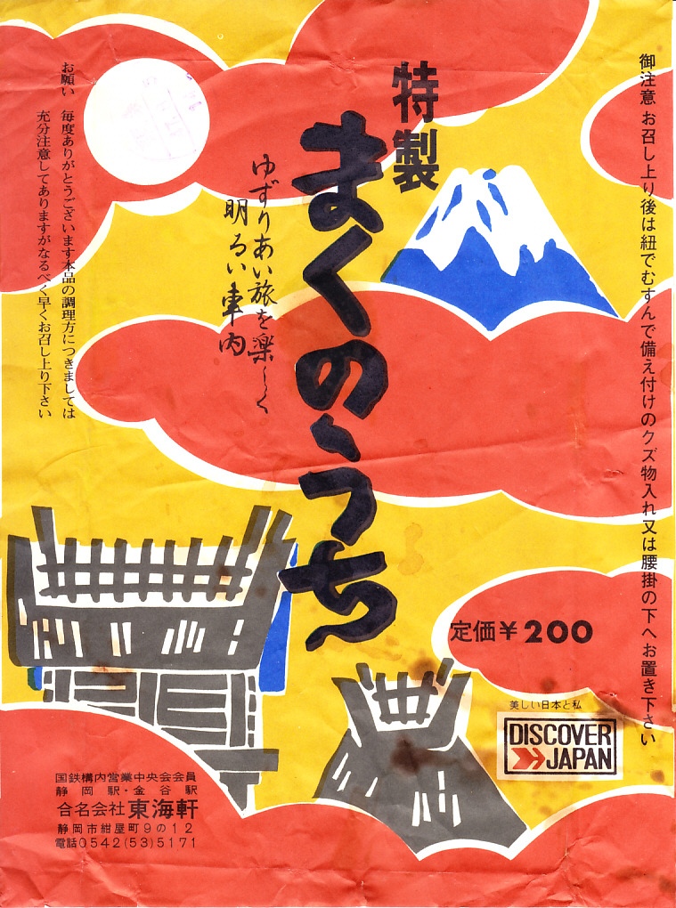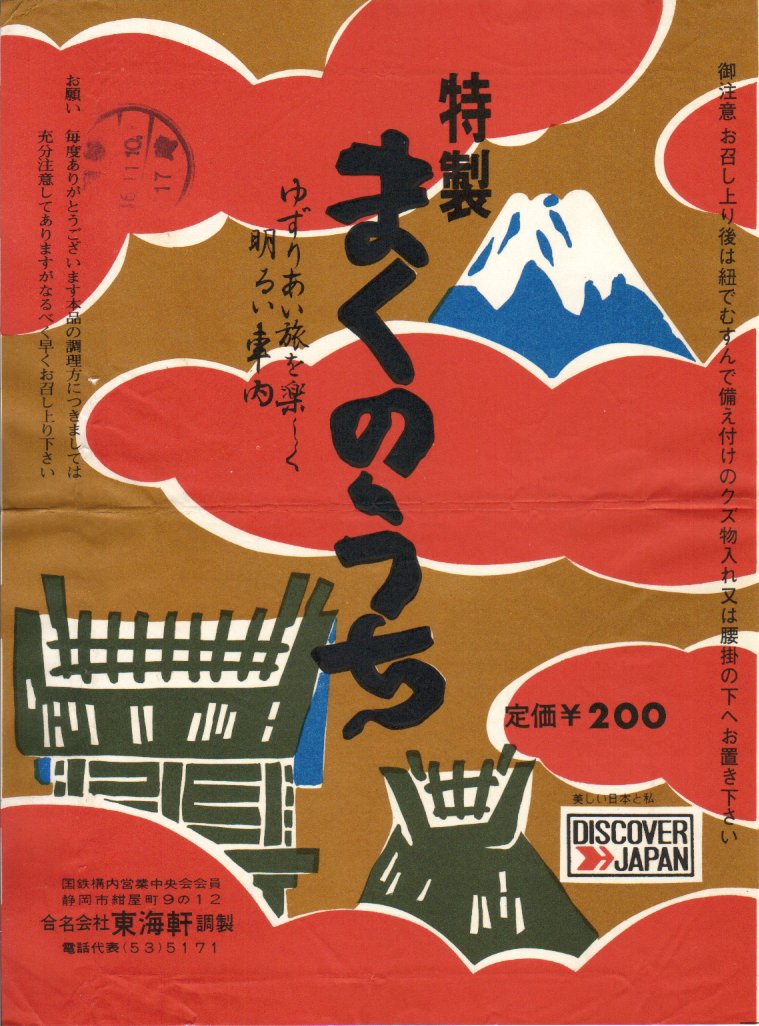 1971(昭和46)年11月10日(水)17時の調製と思われる、昔の静岡駅弁の掛紙。絵柄は1970(昭和45)年10月のものと同じ。これに国鉄の観光キャンペーン「DISCOVER JAPAN」のロゴマークが入り、注意書きや調製元の文字がやや変わっている。
