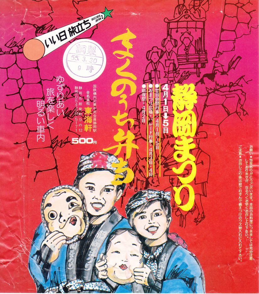 1980(昭和55)年3月30日9時の調製と思われる、昔の静岡駅弁の掛紙。同年4月1日から5日までの静岡まつりを紹介する、この頃の静岡駅の幕の内駅弁で毎年恒例だった記念掛紙。静岡まつりそのものは、1957(昭和32)年から今も毎年4月の第1金土日曜日を中心に駿府城公園などで開催される、駿府で徳川家康公が家臣を連れて花見をしたという故事にならい大御所花見行列などを実施する、静岡市内で最大級のイベントである。