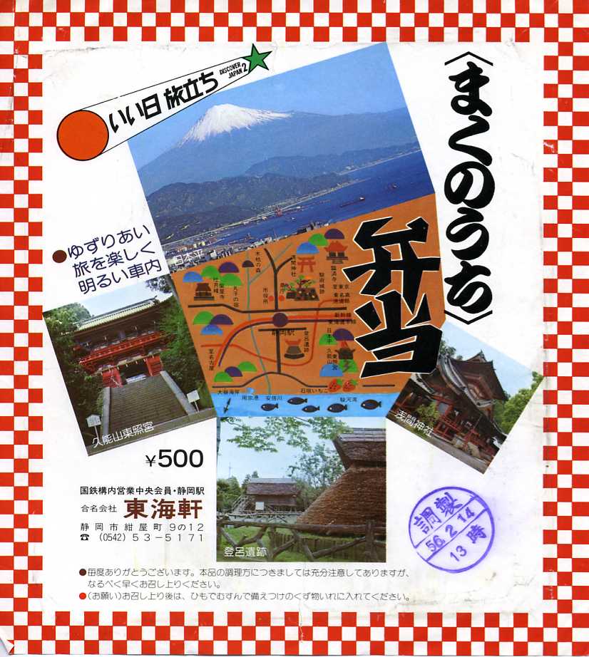 1981(昭和56)年2月14日13時の調製と思われる、昔の静岡駅弁の掛紙。写真と文字でストレートに静岡県内の名所を教えてくれる、とても分かりやすい内容。