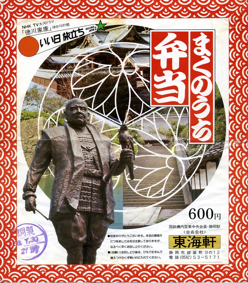 1983(昭和58)年7月30日21時の調製と思われる、昔の静岡駅弁の掛紙。写真は駿府城跡(駿府公園)に立つ徳川家康像と、上から時計回りに久能山東照宮、臨済寺、駿府城跡なのだとか。今や政令指定都市の静岡は、いまだに「のぞみ」が停車せず「ひかり」の半分が通過する、新幹線沿線で最も列車に恵まれない大都市だと思う。