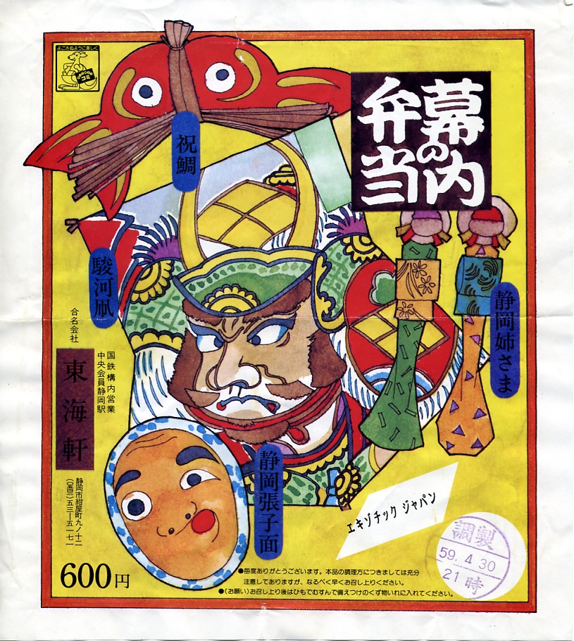 1984(昭和59)年4月30日21時の調製と思われる、昔の静岡駅弁の掛紙。そのデザインは現在と同じ、1982年のものと比べると、東北新幹線開業の文字が取れ、国鉄のキャンペーンが「いい日旅立ち」から「エキゾチックジャパン」に替わっている。