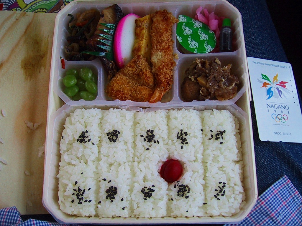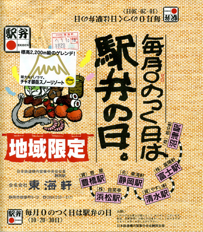 1999(平成11)年1月10日18時の調製と思われる、昔の静岡駅弁の掛紙。清水から豊橋までの駅弁屋六社の共通掛紙に、食品表示ラベルに加えてJR東海が長野県に作ったスキー場の宣伝シールを貼る。この駅弁は豊橋駅以外で現存しているのだろうか。