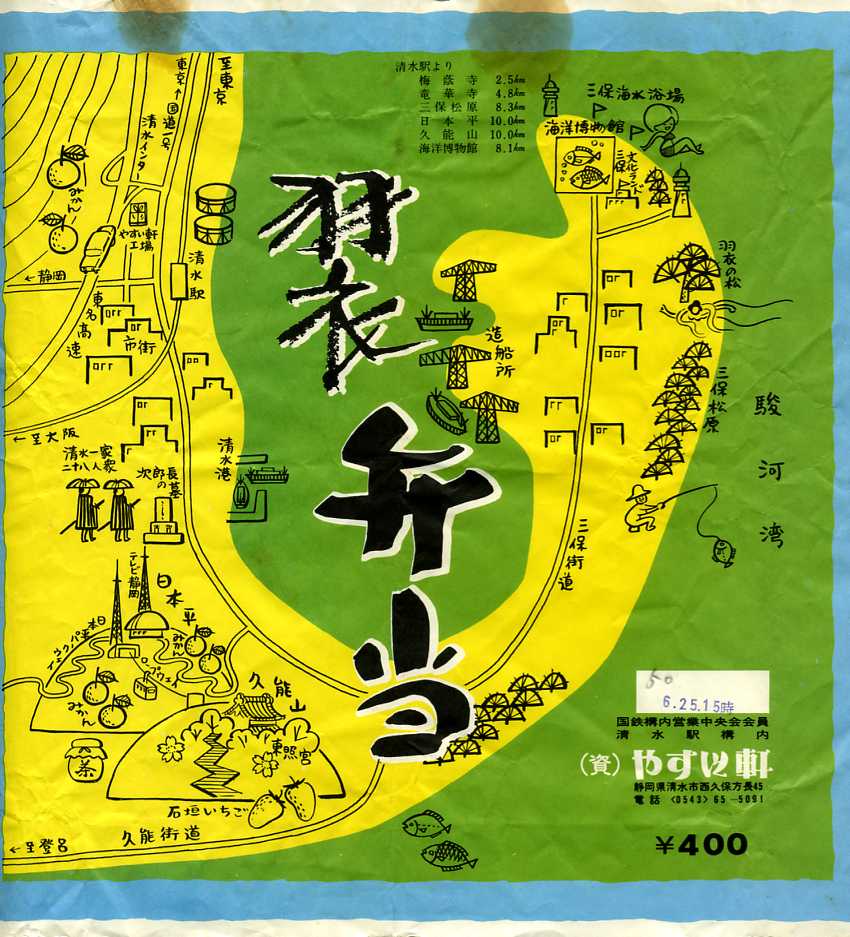 おそらく1975(昭和50)年6月25日15時の調製と思われる、昔の清水駅弁の掛紙。清水の地図を簡易な手書き図で描く。国鉄駅の駅弁の掛紙なのに、一日一往復のみの運行で有名だった国鉄清水港線が描かれておらず、当時で既に地元から忘れ去られた路線だったことがうかがえると思う。