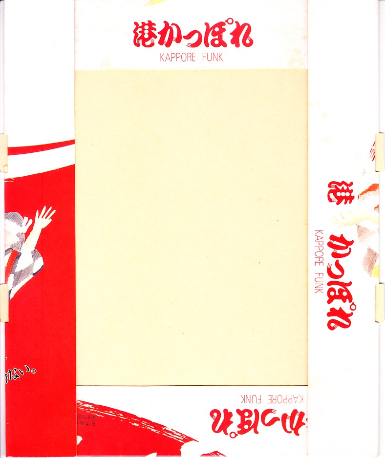 1990(平成2)年6月不明日の調製と思われる、昔の清水駅弁のふた。清水みなと祭りにちなみ、「かっぽれ」と呼ばれる総おどりの光景を描く。この弁当は1991年頃の清水駅弁であったほか、2004年7月に大規模イベント向けの仕出し弁当として1,000円で発売された記録がある。五目寿司ごはんを使った、海産物を多く含む特製幕の内駅弁だったらしい。