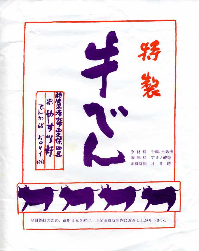 おそらく2003(平成15)年5月12日の調製と思われる、かつての清水駅の駅弁屋のお弁当の掛紙。どう見ても古めかしいが、消費期限の欄があるのに調製時間の欄がないので、21世紀の掛紙であることが分かる。