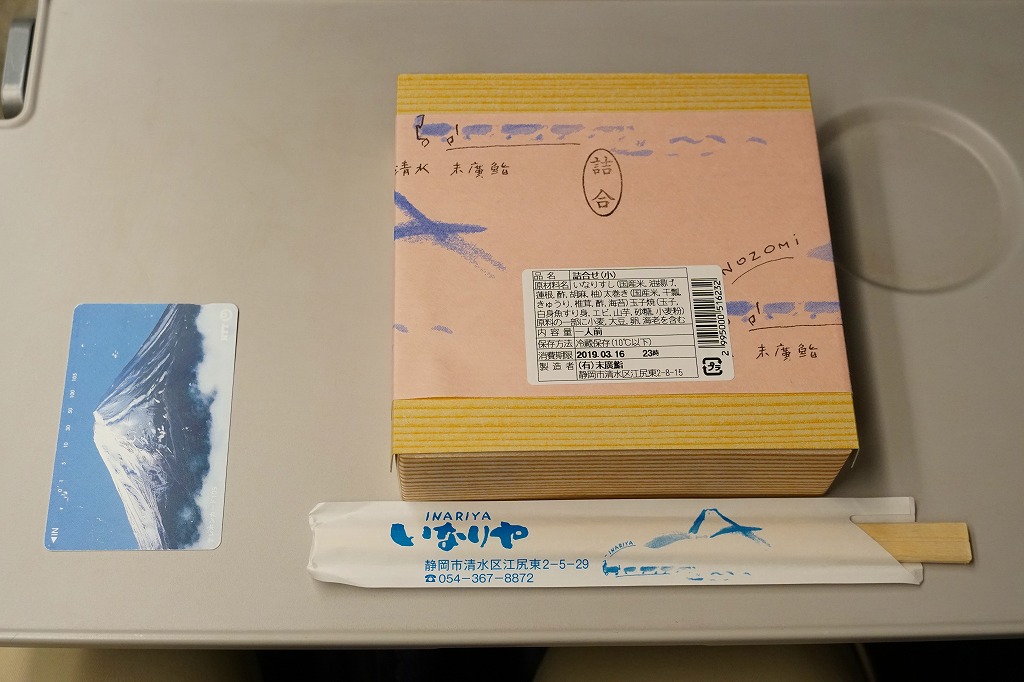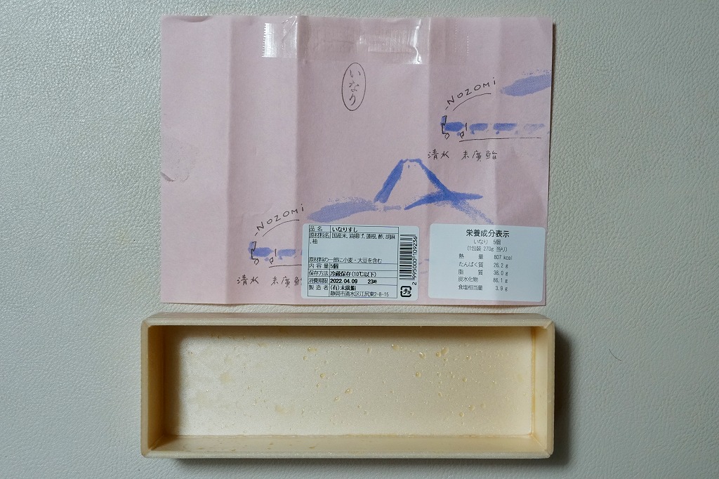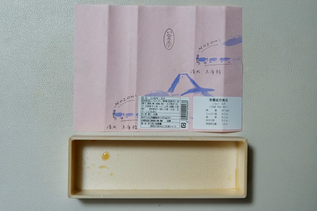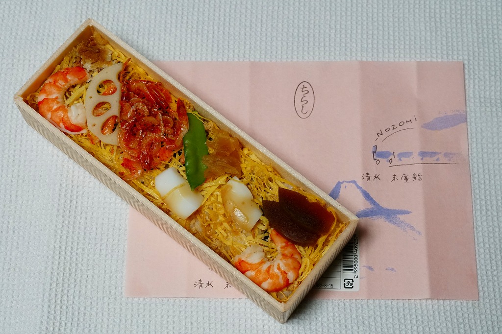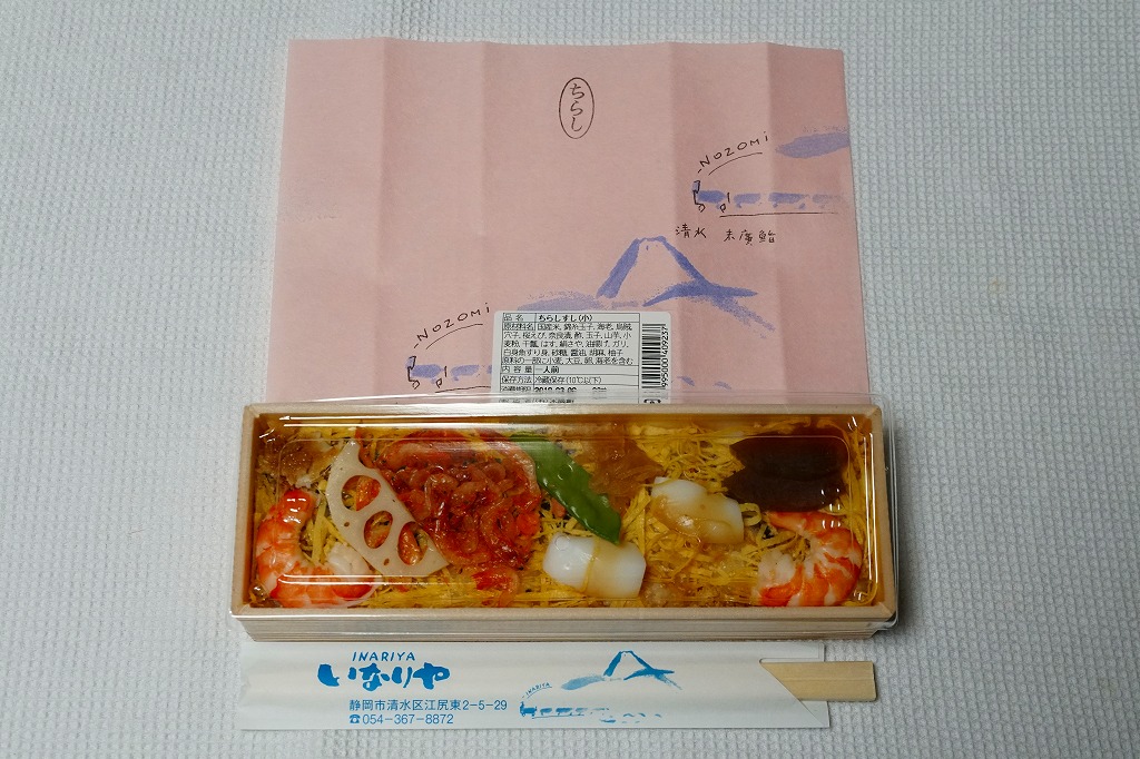 中身に駅弁らしい個性と地域性があり、目でも口でも感じる美しさ。容器や包装や販売形態の素っ気なさが惜しくなる、駅弁へ育てられるであろう駅売り軽食。調製元は静岡では有名な清水市街の高級寿司店で、近所に廉価な持ち帰り寿司店「いなりやNOZOMI」を営業し、これはそこの商品である。価格は2006年時点で525円、2015年時点で561円、2019年時点で648円、2022年時点で670円。