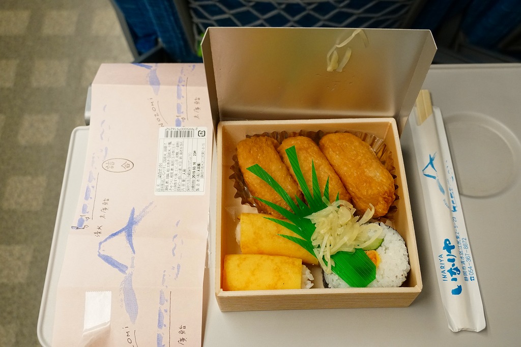 2000年代に清水駅弁と紹介され始めた、駅売り弁当類群のひとつ。細長い容器の中に、いなりずし5個を詰めたお惣菜。これに全種類共通ながら、鉄道らしい風景を描いた掛紙をかける。味は普通に柔らかい、中の上。刻みレンコンが酢飯の中に混入してあり、この食感がアクセントとなる。価格は2006年時点で420円、2015年時点で486円、2022年時点で562円。
