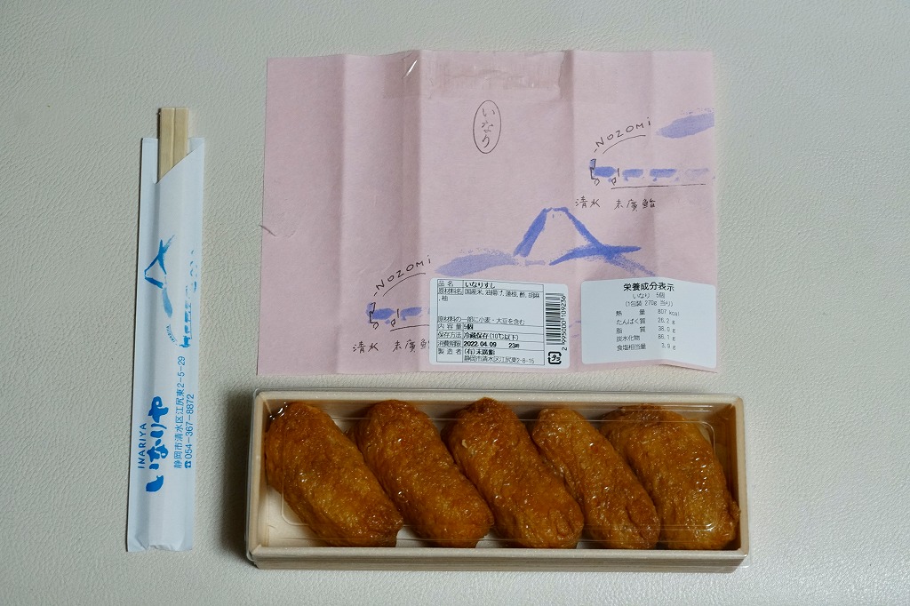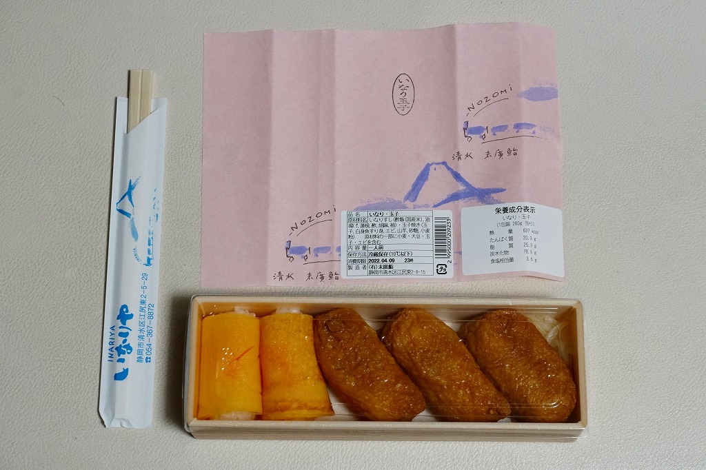 2000年代に清水駅弁と紹介され始めた、駅売り弁当類群のひとつ。細長い容器の中に、いなりずし3個と玉子巻2個を詰めた惣菜弁当。ピンク色の掛紙には富士山と、「NOZOMi」と書かれた蒸気機関車牽引と思われる列車が描かれる。価格は2006年時点で472円、2015年時点で453円、2022年時点で497円。