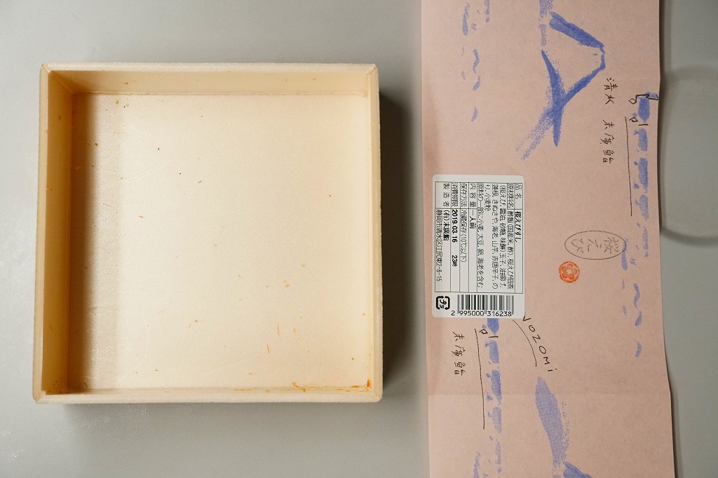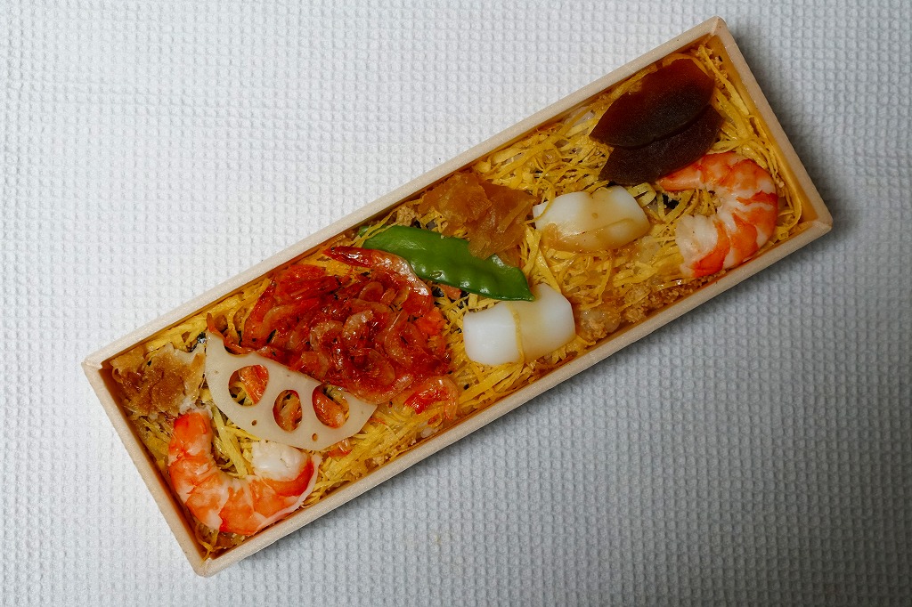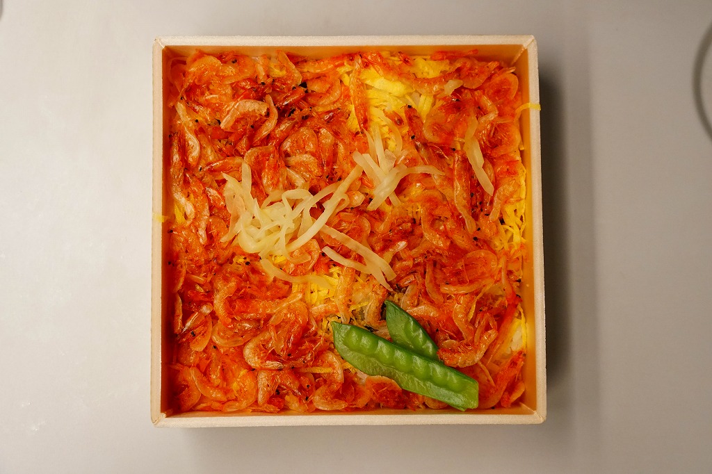 中身は五目酢飯を油揚げそぼろと錦糸卵で覆い、サクラエビ、小海老、イカ、アナゴ、れんこん、かんぴょう、きぬさや、奈良漬などを散らすもの。小腹に効く小箱で、見た目や風味は控えめに華やかで賑やか。(小)でないちらしすしを、駅で見たことはない。価格は2019年の購入時で562円、2022年時点で605円。