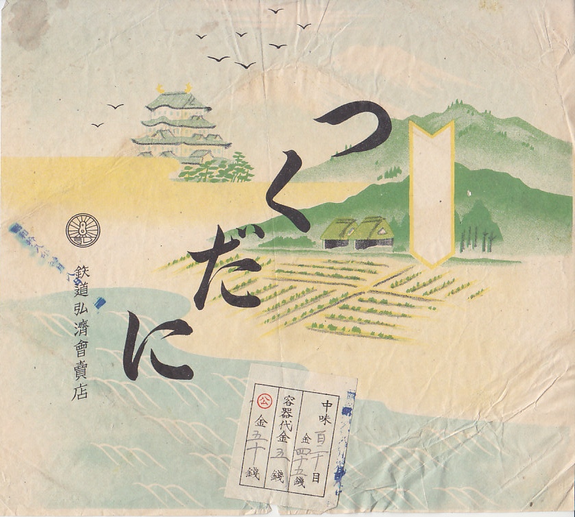 1943(昭和18)年3月8日の調製と思われる、昔のどこかの駅弁の掛紙。弁当でなく佃煮の包装紙か。中身120目(グラム?)で45銭、容器代金5銭で、金50銭と内訳を記したのは、1940年の改正暴利行為等取締規則に基づくマル公マークによるものか。鉄道弘濟会賣店は本州北海道四国九州の各地にあり、掛紙に駅名や地名の表記がないためどこのものかわからないが、名古屋城にそっくりな天守が描かれるため、名古屋エリアのものではないかと想像する。