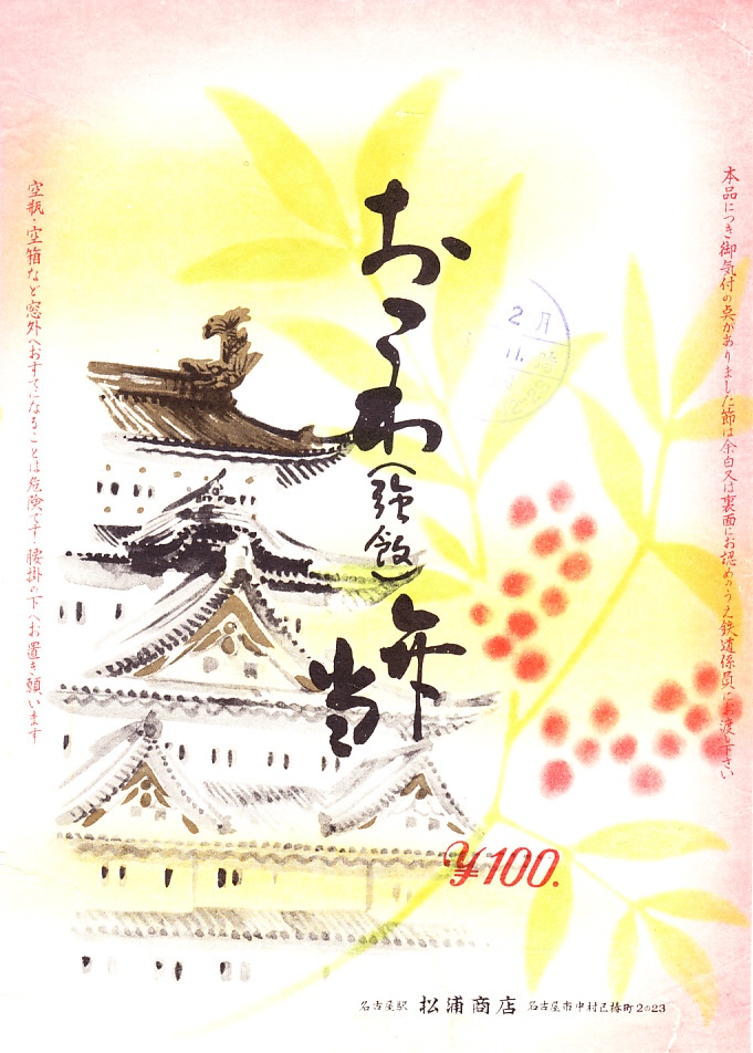 1960年代のものと思われる、昔の名古屋駅弁の掛紙。名古屋城天守を描く絵柄は下記のものと同じだが、色彩が明らかに異なる。