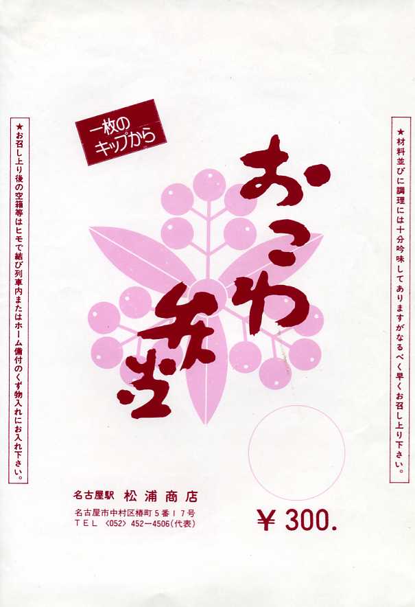 昭和50年代のものと思われる、昔の名古屋駅弁の掛紙。価格帯の低い駅弁用だったのか、単色刷のシンプルで、しかし当時の国鉄の旅行キャンペーン「いい日旅立ち」のマークはしっかり入っている。