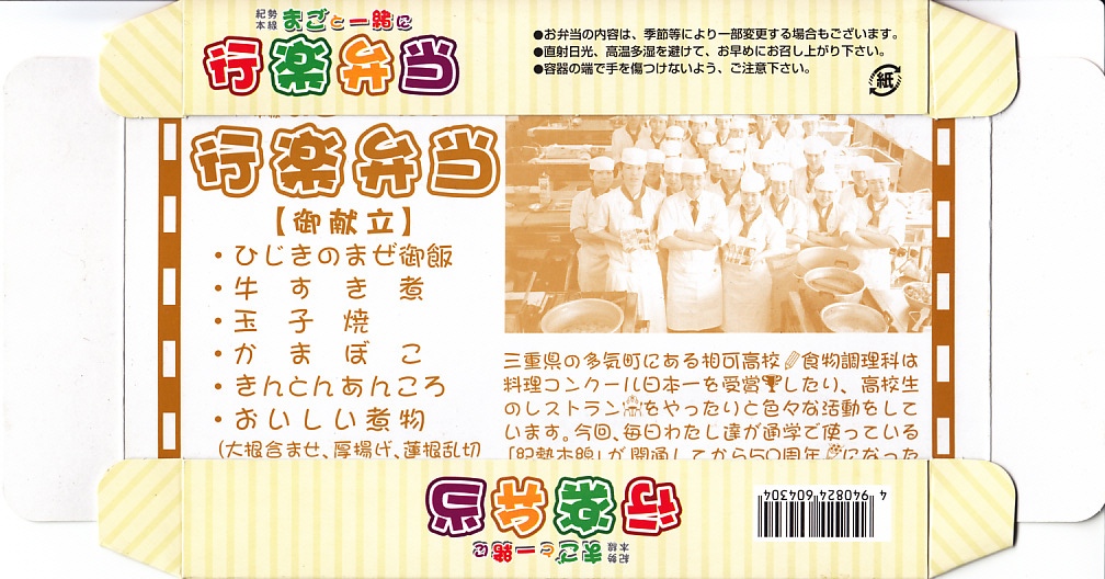 2011(平成23)年10月までに商品化された、三重県立相可高等学校村林新吾先生監修のお弁当。同年10月8〜10日に東京駅で開催された「第14回東日本縦断駅弁大会」で、名古屋駅の駅弁として販売されていたもの。
