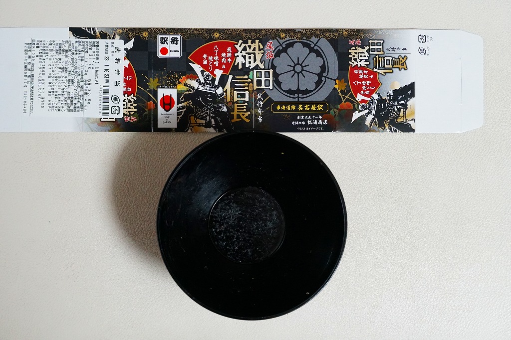今回は黒いプラ容器が円錐状とボウル状で2種類あり、この織田信長は円錐状のもの。これに織田家の家紋を入れ、日本古窯弁当と同じ半透明のふたをして、今回のシリーズで共通のしおりを置き、それらしき絵柄のスリーブで留める。中身は白飯を八丁味噌焼鶏、焼鮭、塩だれ飛騨牛焼肉、ごぼうやタケノコなどの煮物で覆うもの。牛に鶏に鮭と欲張りな構成で、具の種類が多く賑やかに思える。