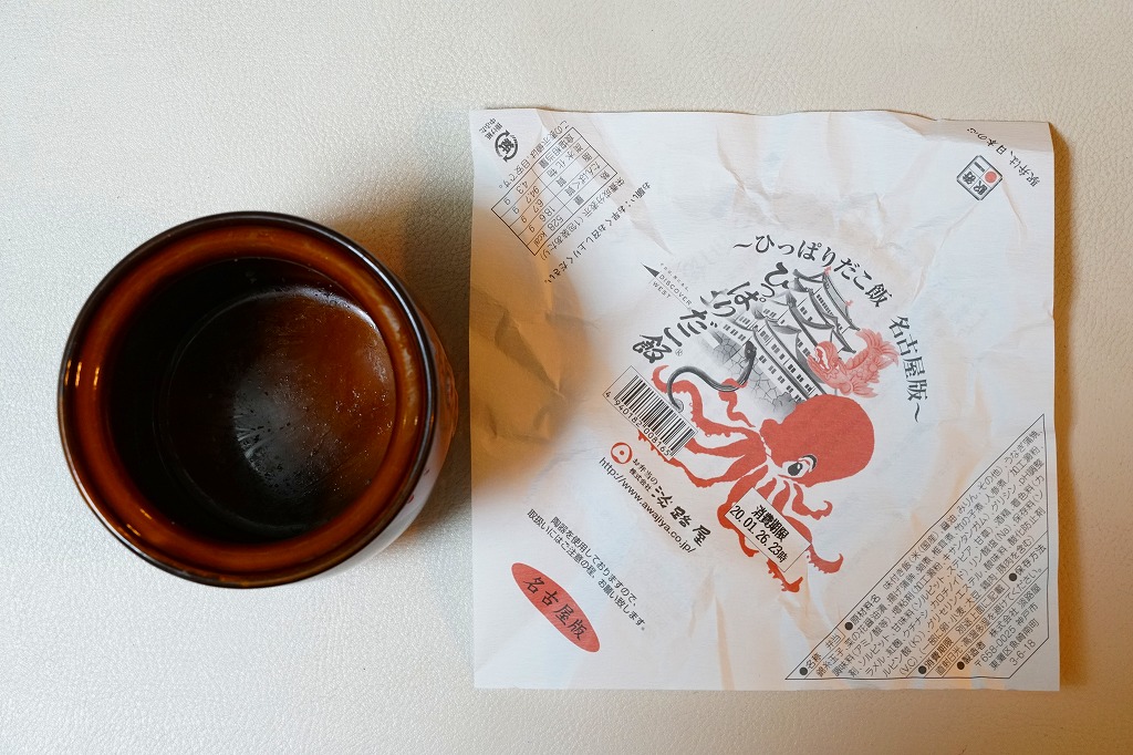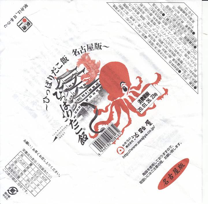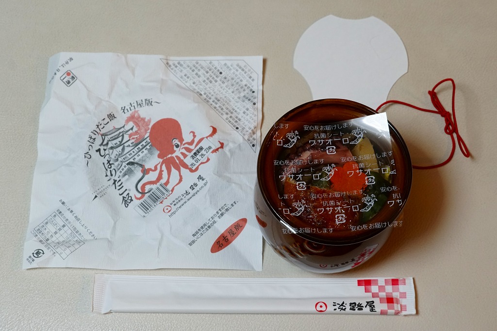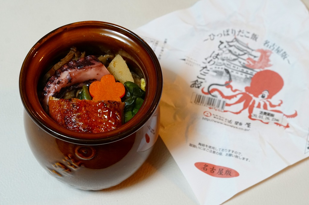 2020(令和2)年1月に阪神百貨店の駅弁大会で販売。西明石駅と日本を代表する人気駅弁「ひっぱりだこ飯」について、その発売20周年で2018(平成30)年8月に福岡版、翌9月に広島版が登場し、その第3弾に見えたがどうだろう。名古屋駅で売られたという話は聞いていない。見た目や内容や風味は、西明石駅弁とほとんど同じ。名古屋版ということで、掛紙に名古屋城を描き、中身にウナギ蒲焼の小片を加えた。名古屋駅で売られたかどうかは分からない。
