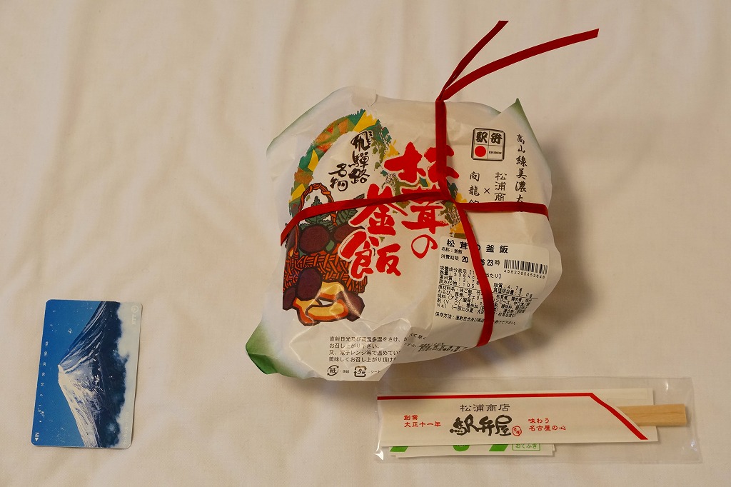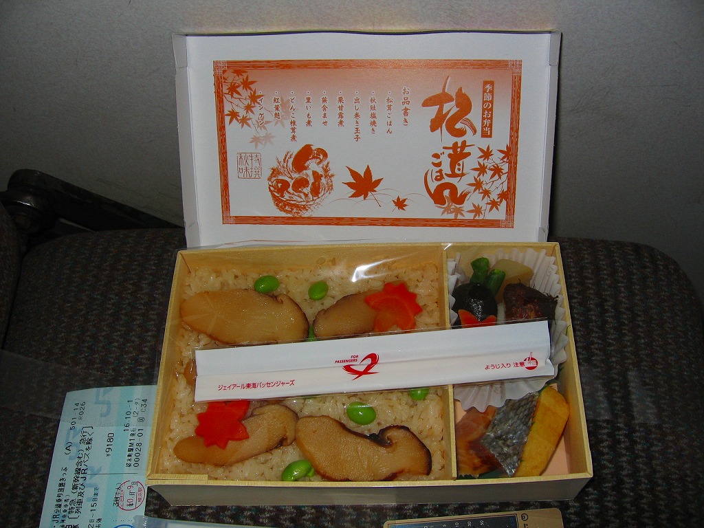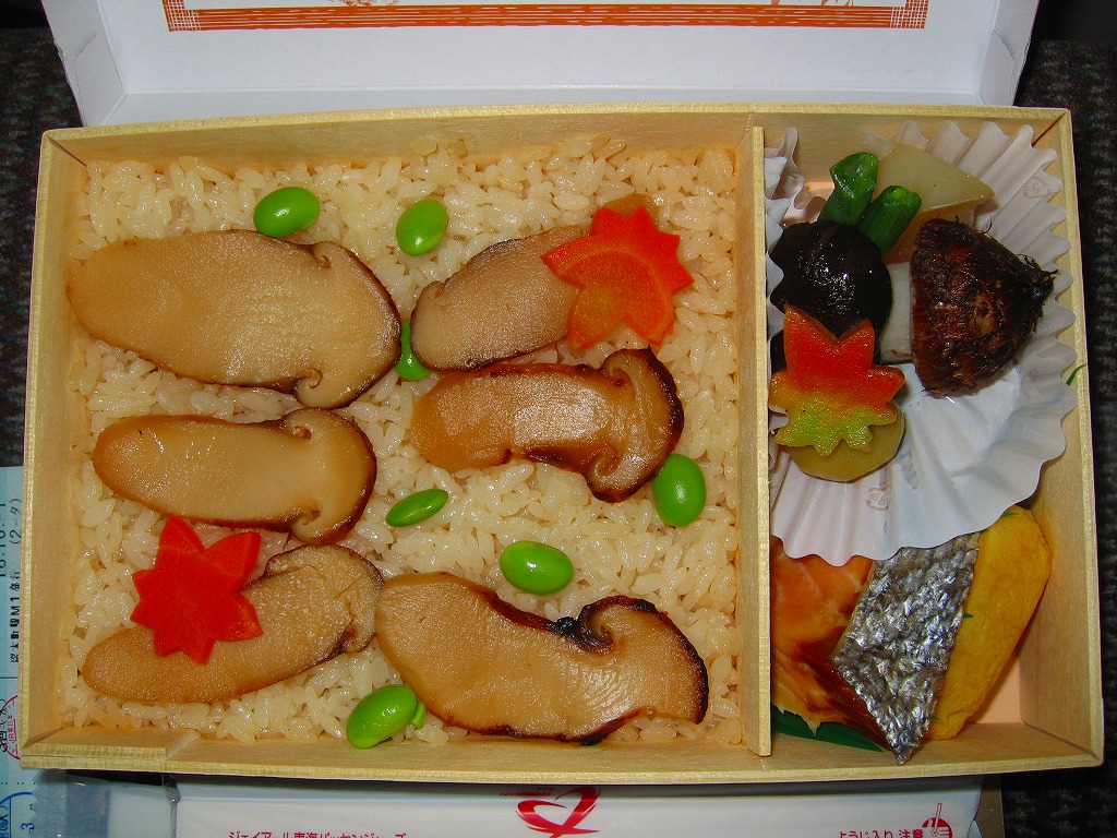 名古屋のJRCPの、季節のお弁当。小さな経木枠の長方形の容器に枠付きの紙のふたをかける。中身は駅弁の名前そのままの松茸御飯、エンドウマメと紅葉型人参に彩られて、50×20×2mm程度と駅弁にしては大きい松茸が6切れも御飯の上に載り、松茸の味と香りがいつまでも口の中に残る。