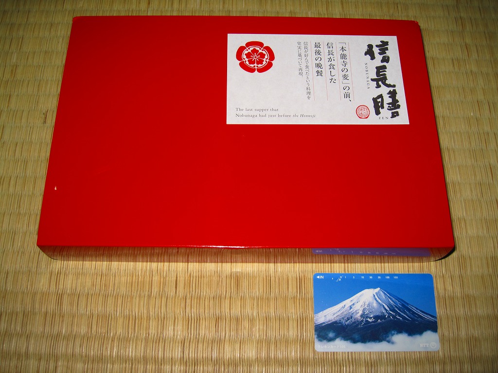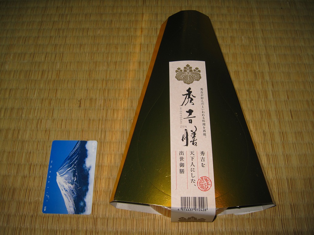 戦国時代に天下統一を果たした豊臣秀吉を徳川家康が招いた餐応料理を再現したという。食材は御飯を除きすべて豊臣秀吉にちなんでいることが、正方形に折りたたまれたしおりで確認できる。その他にも秀吉へのこだわりが垣間見える、よく考えられた作品であり、戦国時代を舞台にした漫画作品やゲームの流行による歴史ブームの中で堂々と京王百貨店駅弁大会へ出陣してきたにもかかわらず、会場では三英傑揃って閉店まで山積みという惨敗を喫した印象。駅弁大会ではやはり、シンプルなものが好まれるのだろうか。この京王百貨店の駅弁大会で引退か。