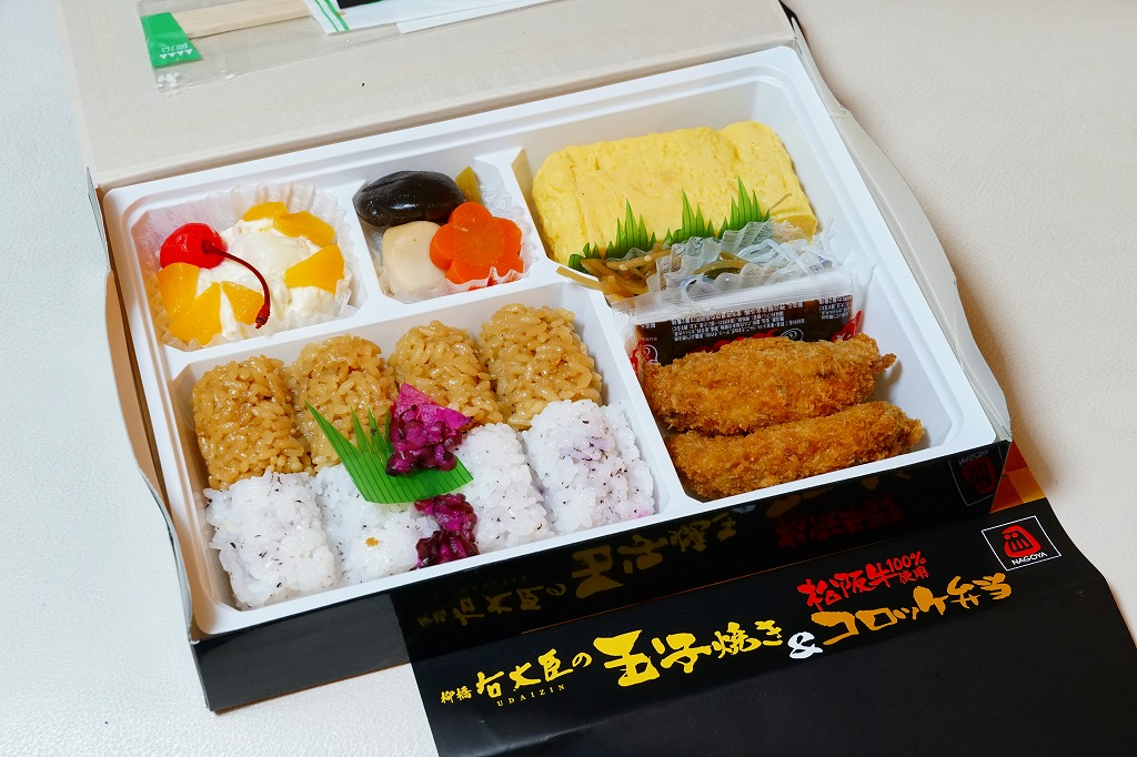 2019(令和元)年の5月までに発売か。市販の大きな惣菜弁当向けボール紙製容器に、鶏飯とゆかりごはんの俵飯を4個ずつと、名古屋駅前の柳橋中央市場で玉子焼の名店である柳橋右大臣を名乗るきな玉子焼、きんぴらごぼうと春雨サラダ、松阪牛100%使用というコロッケとソース、サトイモやシイタケなどの煮物、ポテトサラダと黄桃とチェリーを詰める。量の多さと脈絡のない内容が個性的。御飯のおかずに困る印象はある。1年弱の販売か。
