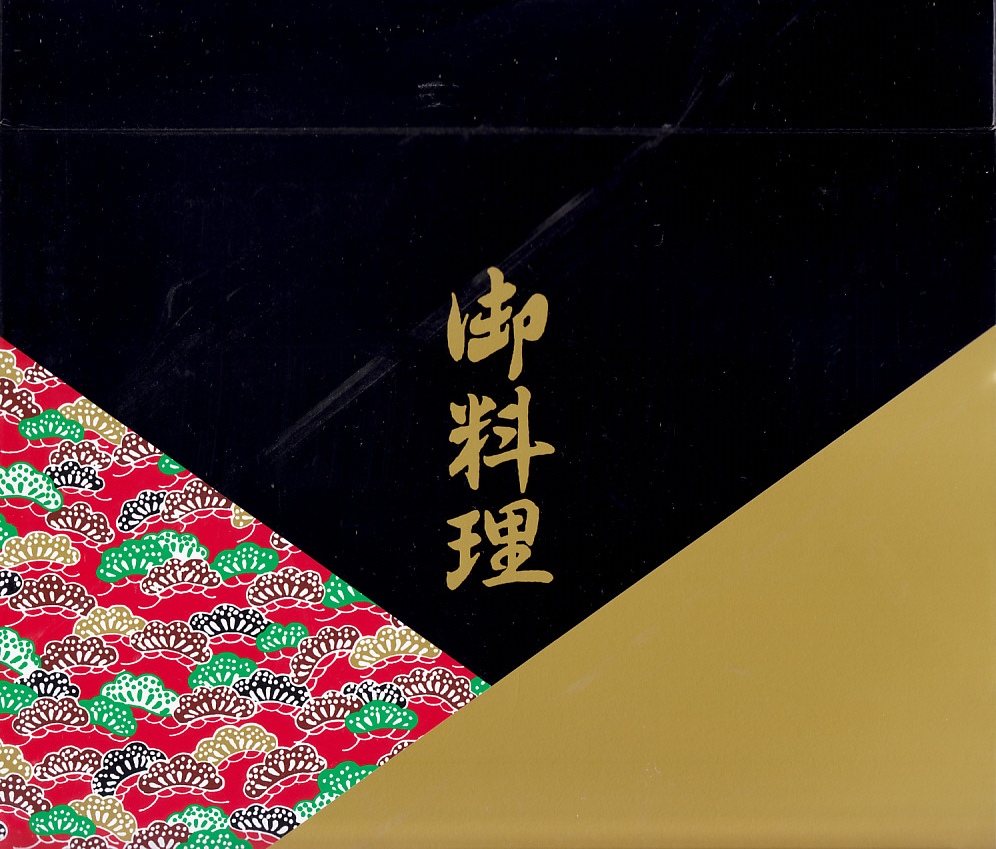極彩柄の正八角形の容器を二段重ねにして、和紙風の紙袋に収納する。中身は下段が栗おこわ、上段が焼サワラ、穴子八幡焼、チキンロール、昆布巻、玉子焼、蒲鉾、海老、昆布巻、タケノコや里芋などの煮物など。