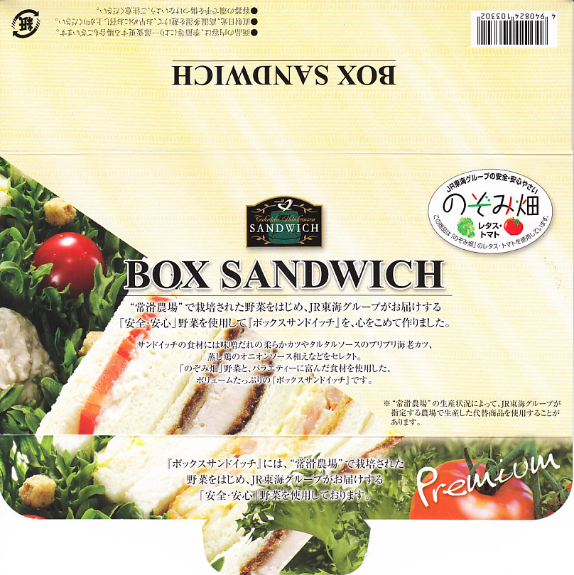 企業の参入を阻止してきた農業関連法制の緩和への期待や、2007年末の冷凍餃子中毒事件以降の中国産食品に対する不安の増大などからか、2008年の秋にJR東日本とJR東海が相次いで農業ビジネスへの参入を表明、翌年には農協との合弁ないし子会社を通して野菜の生産を始めた。JR各社には新潟のスッポンから函館のダチョウやカリフォルニアの米まで、第一次産業への進出がことごとく失敗している過去があるのだが、はたして今回はうまくいくのだろうか。2017年時点で、のぞみ畑は健在だが、このような箱入りサンドイッチの販売は終了した模様。