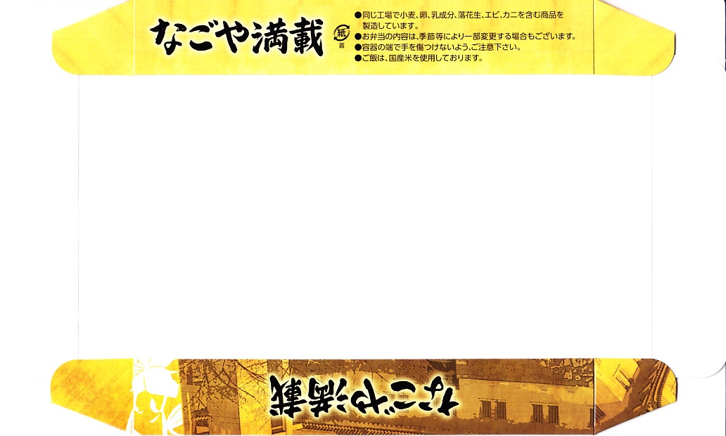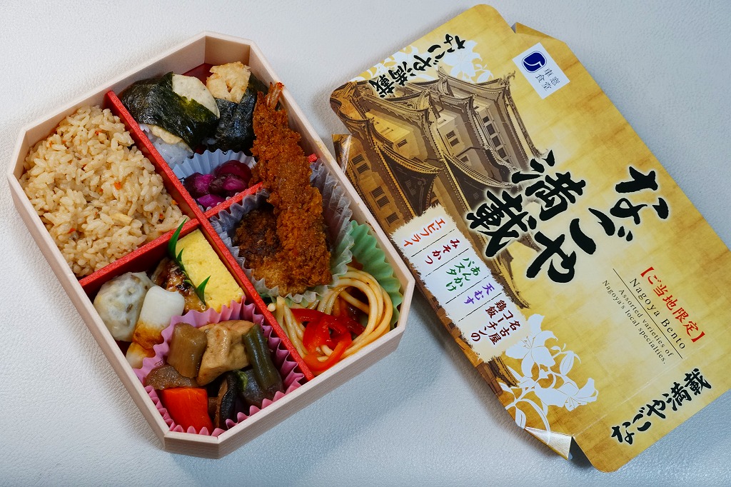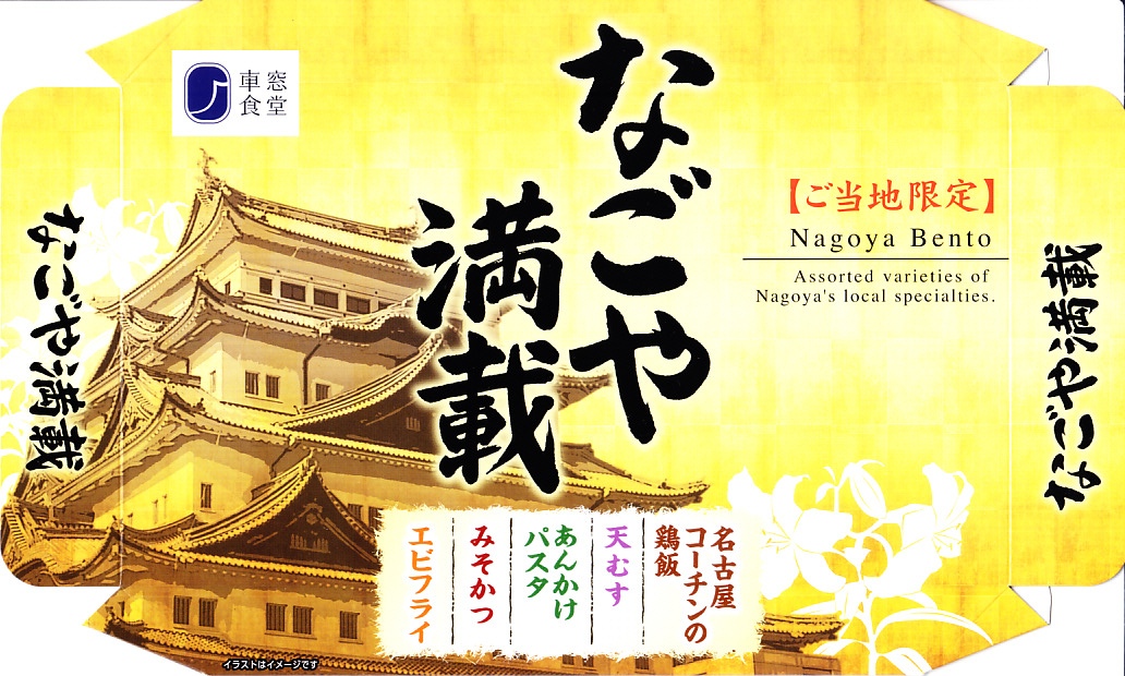 2015(平成27)年5月28日のリニューアル。従前は「特撰弁当名古屋」という、東京・名古屋・京都・新大阪の各駅別に設定した季節の幕の内弁当であったが、名古屋以外のものは消えた。名古屋城天守閣の写真を使う派手な絵柄のボール紙ふたにリストを書くとおり、中身はみそかつ、鶏おにぎり、牛うま煮、エビフライ、天むす、ういろうなど。東京の人が期待する名古屋を、一覧としてしっかり押さえた。2016年11月に「なごや満載」へリニューアル。