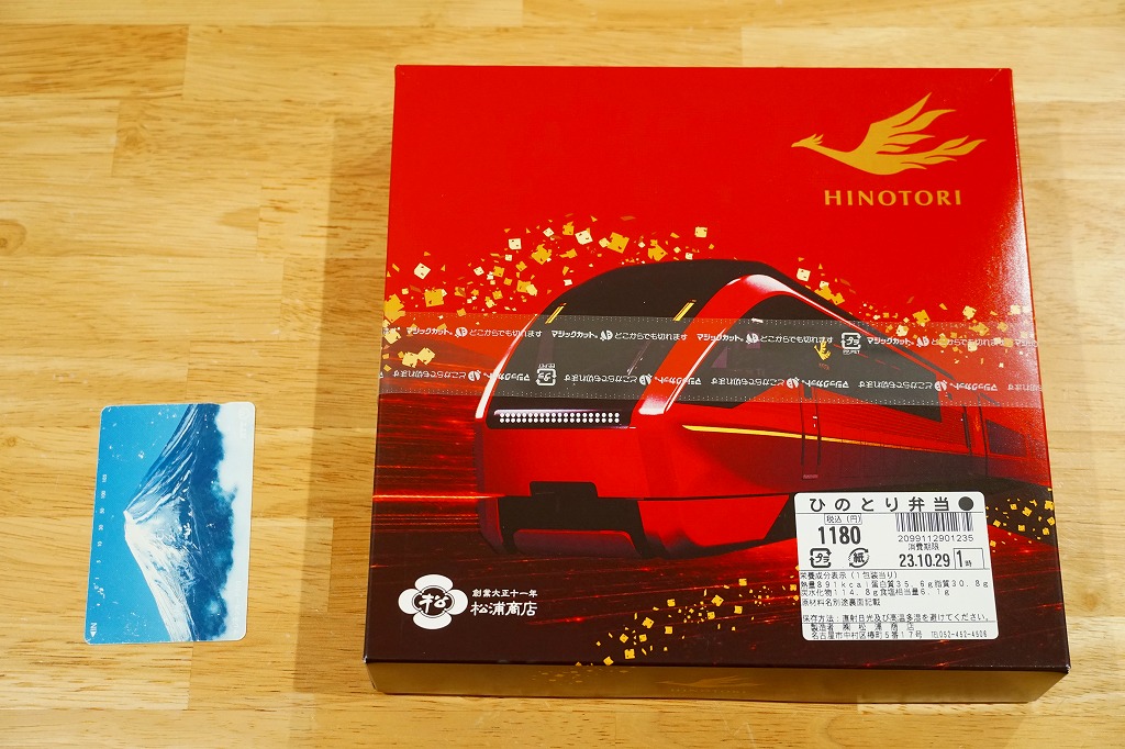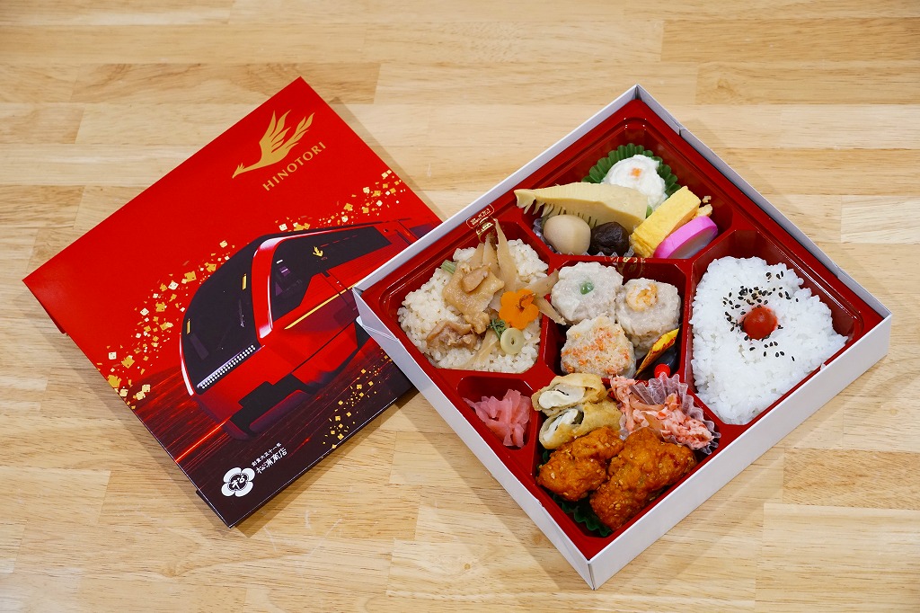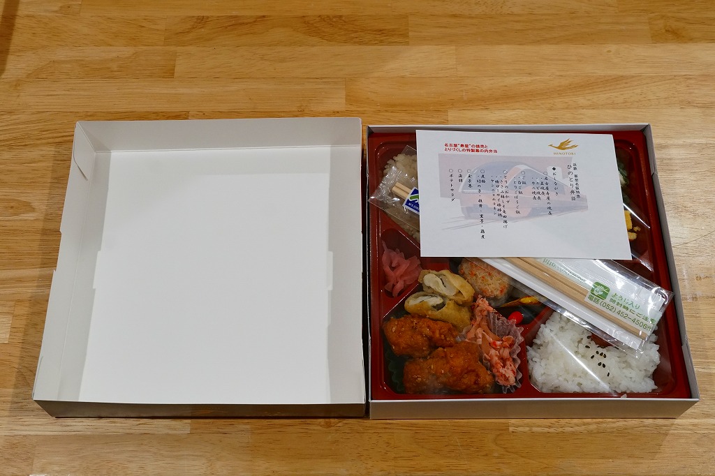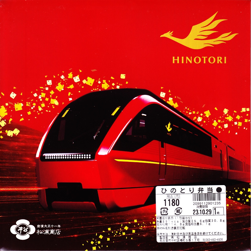 2021(令和3)年7月までに近鉄名古屋駅で発売か。2020年3月に近鉄の名阪甲特急で、近鉄名古屋駅と大阪難波駅を約2時間で結ぶ特急列車でデビューした80000系電車「ひのとり」にちなむお弁当。大阪難波駅では2020年8月に神戸駅弁の淡路屋が「名阪特急ひのとり弁当」を発売、こちらの調製元は名古屋駅弁の松浦商店なので、名阪の駅弁屋が同じ題材で駅弁を競演する。外箱の絵柄はいずれも特急電車「ひのとり」で、おそらく近畿日本鉄道から公式に提供されたCGだろうから、見た目はほぼ同じ。ふたを開けて食べ比べて、その違いに気が付くことになる。