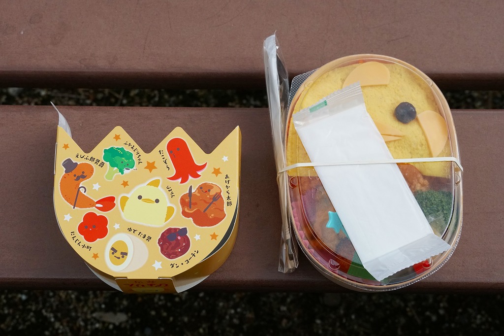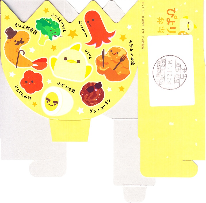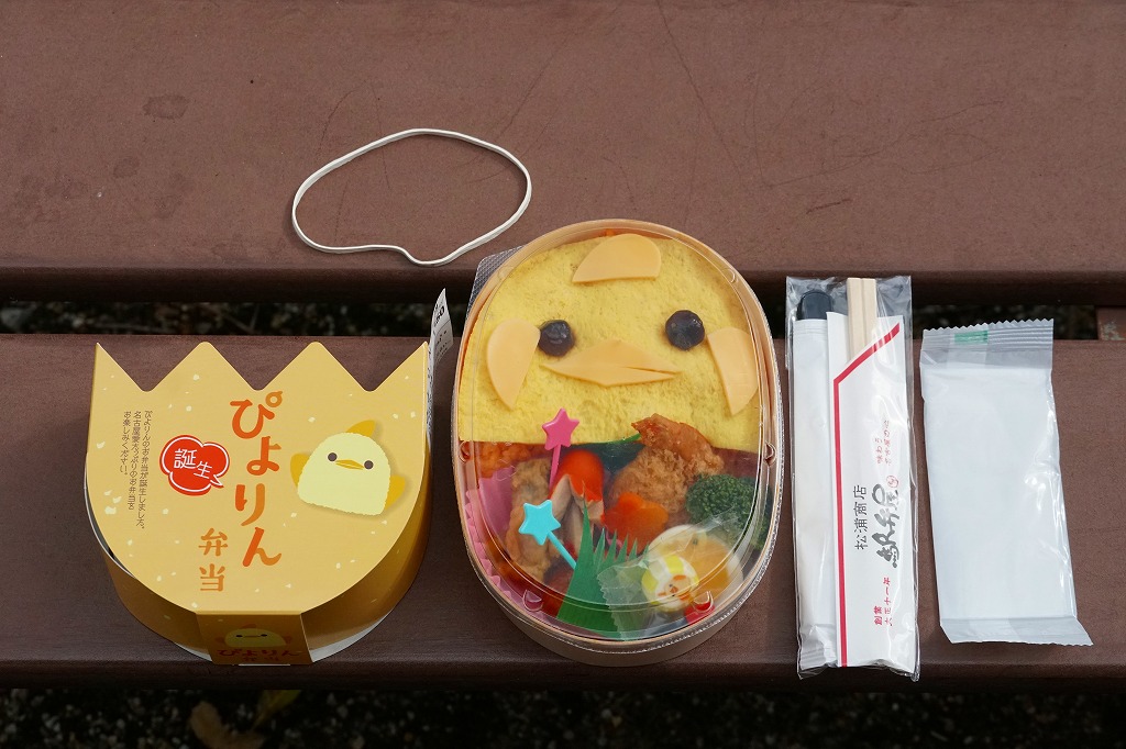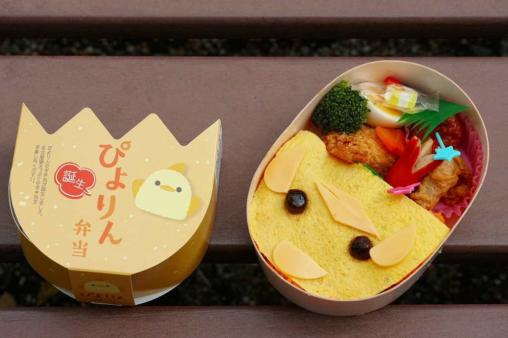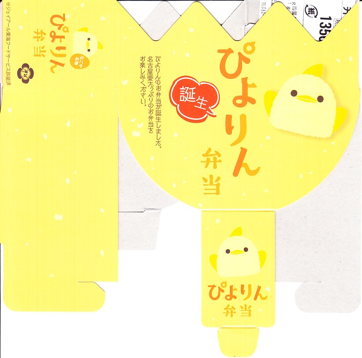 2023(令和5)年10月1日から名古屋駅の売店「グランドキヨスク」「デリカステーション」各1店舗で一日計200個を販売。名古屋駅で人気のスイーツ「ぴよりん」がテーマの駅弁で、調製元は名古屋駅弁の松浦商店。楕円形の容器は鶏卵を、この容器を半分だけ覆うスリーブは卵の殻を、そこから顔を出す中身の一部はひよこを表すのだろう。スリーブの底面では中身の食材をかわいらしく描く。