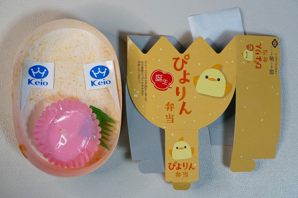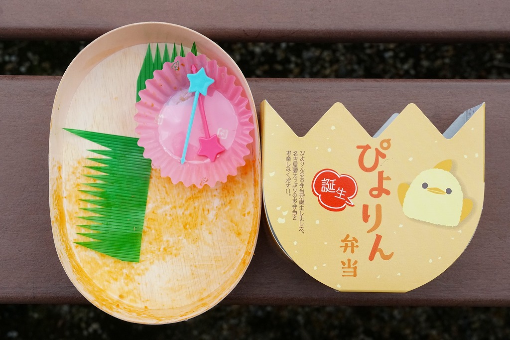 この木質容器の半分に、ケチャップライスを敷いて玉子焼で覆い、チーズとタピオカでひよこの顔を描く。半分はおかずで、名古屋コーチンの鶏唐揚と鶏肉団子とゆで卵、エビフライ、たこ型ウインナー、ブロッコリー、花型にんじん、ぴよりん柄のキャンディ。このかわいらしい鶏肉駅弁は、朝8時の名古屋駅で奪い合われていた。ぴよりん人気、恐るべし。