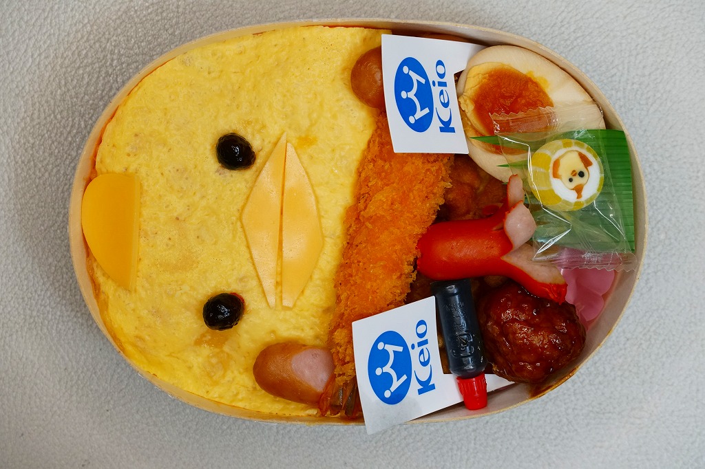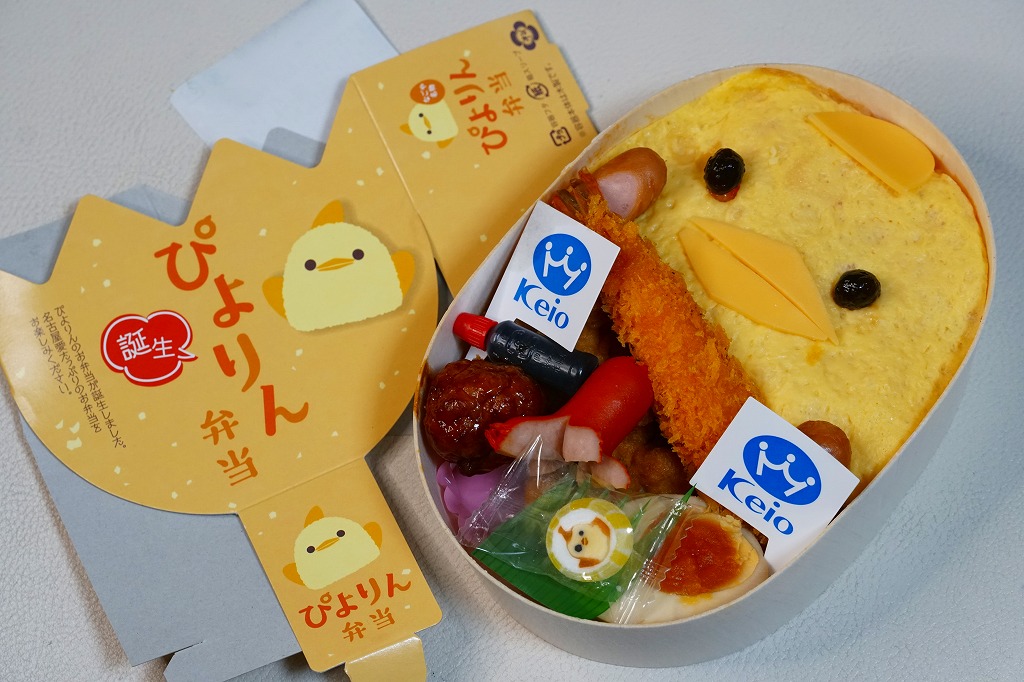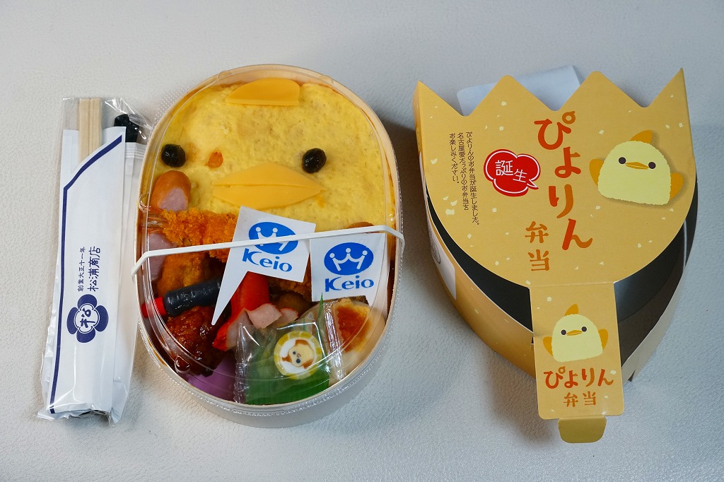 名古屋駅で人気の駅弁を、2024(令和6)年1月の京王百貨店の駅弁大会で実演販売。ただ、ぴよりんの神通力は東京に来られなかったのか、催事場で待つことなく買えた。スリーブと容器と価格は、上記の現地版と同じ。中身がやや異なり、ブロッコリーとにんじんがなく、手がチーズでなくソーセージであり、星形スティックに代えて京王百貨店のロゴマークの小旗を持たされた。