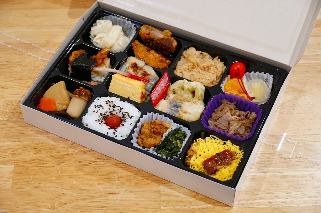 正八角形の黒い発泡材製容器をラップで密封し、商品名や中身のイラストなどを記した紙帯を巻く。4区画の中身はそれぞれ、桜でんぶで桜色になったちらし寿司という名の握り飯、ひつまぶし風うなぎめし、味噌だれロースカツとおからときんぴらごぼう、玉子焼きと鶏つくねと根菜類の煮物など。