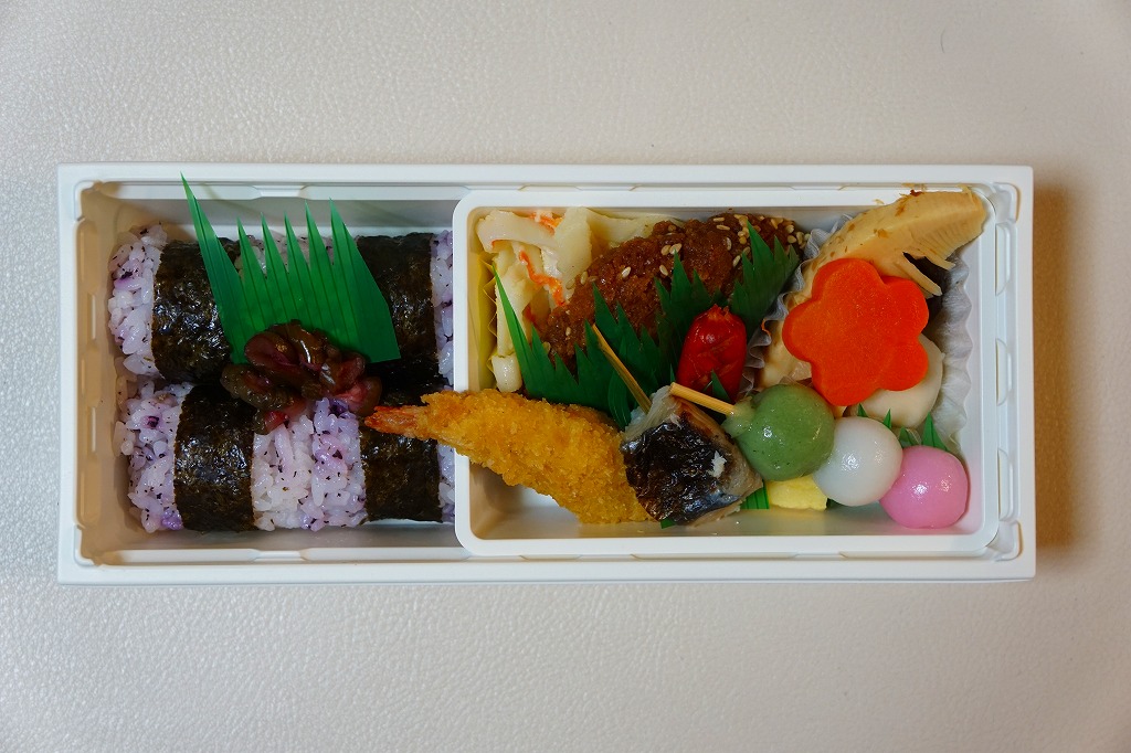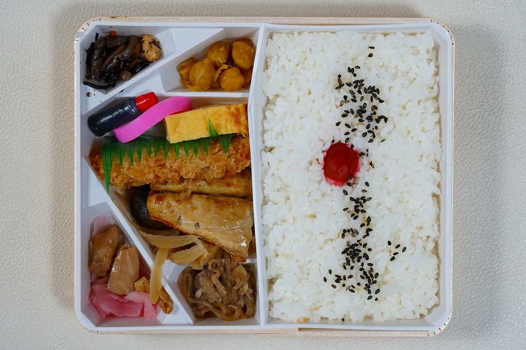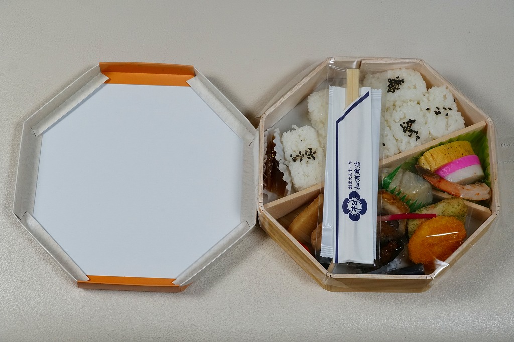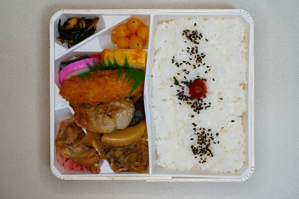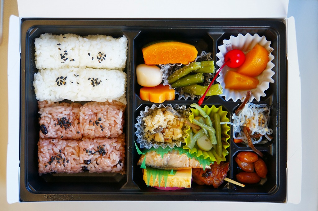 2008(平成20)年か、それ以前の発売か。仕出し弁当風の専用紙箱に収まる黒いトレーの中に、白御飯と赤飯の俵飯、焼きサバ、かまぼこ、玉子焼、カボチャやサトイモなどの煮物、山菜、うの花、インゲンのごま和え、春雨、ピーナッツ煮、桃とチェリーなど。駅弁ではまず見ないうの花(おから)が入ることが印象的。