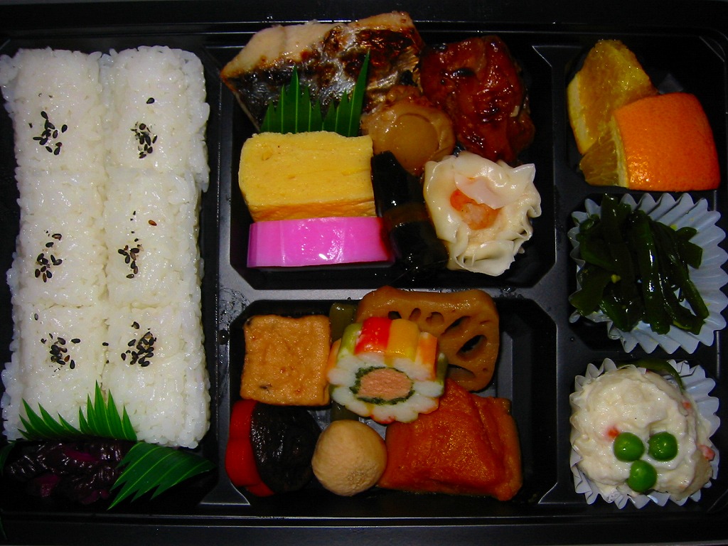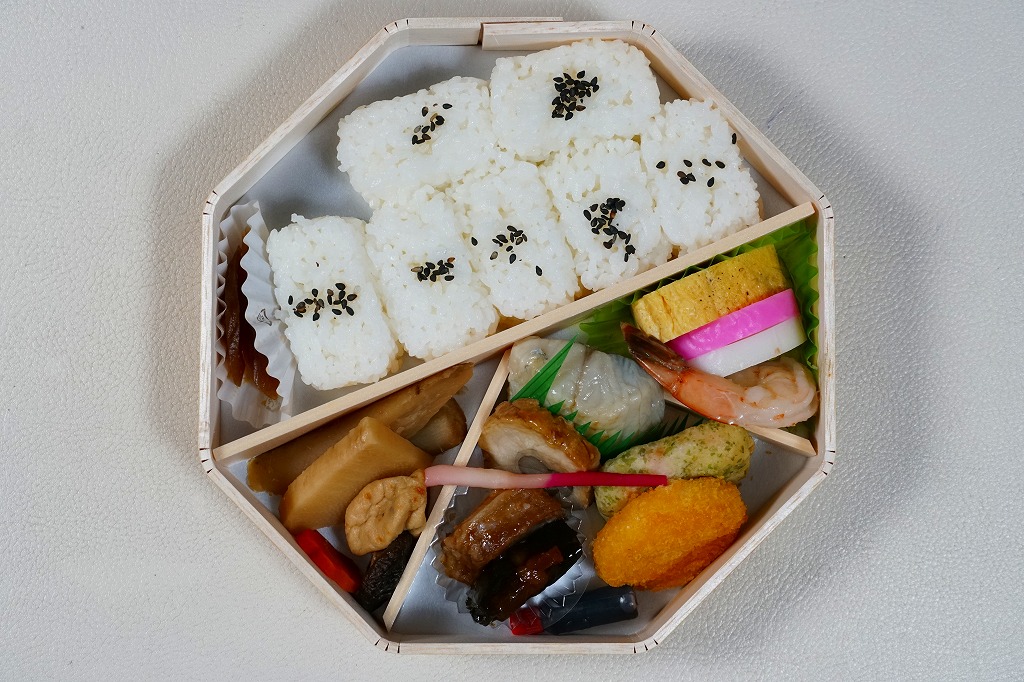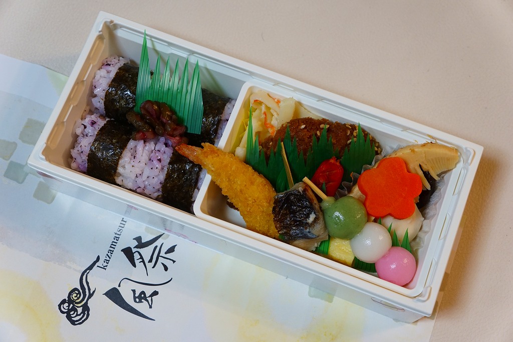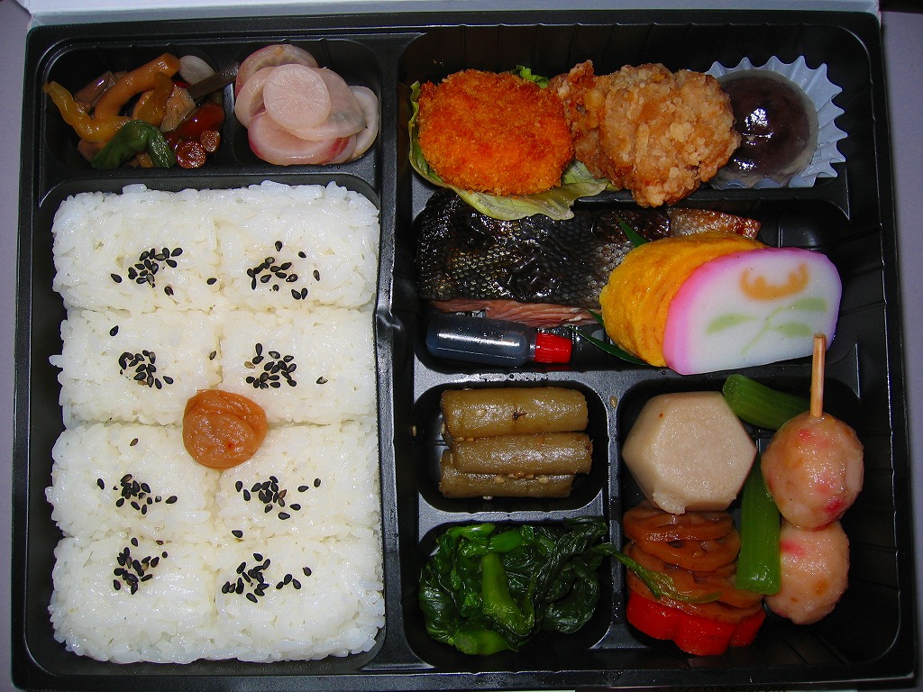 2008(平成20)年か、それ以前の発売か。仕出し弁当風の専用紙箱に収まる黒いトレーの中に、白御飯と赤飯の俵飯、焼きサバ、かまぼこ、玉子焼、カボチャやサトイモなどの煮物、山菜、うの花、インゲンのごま和え、春雨、ピーナッツ煮、桃とチェリーなど。駅弁ではまず見ないうの花(おから)が入ることが印象的。