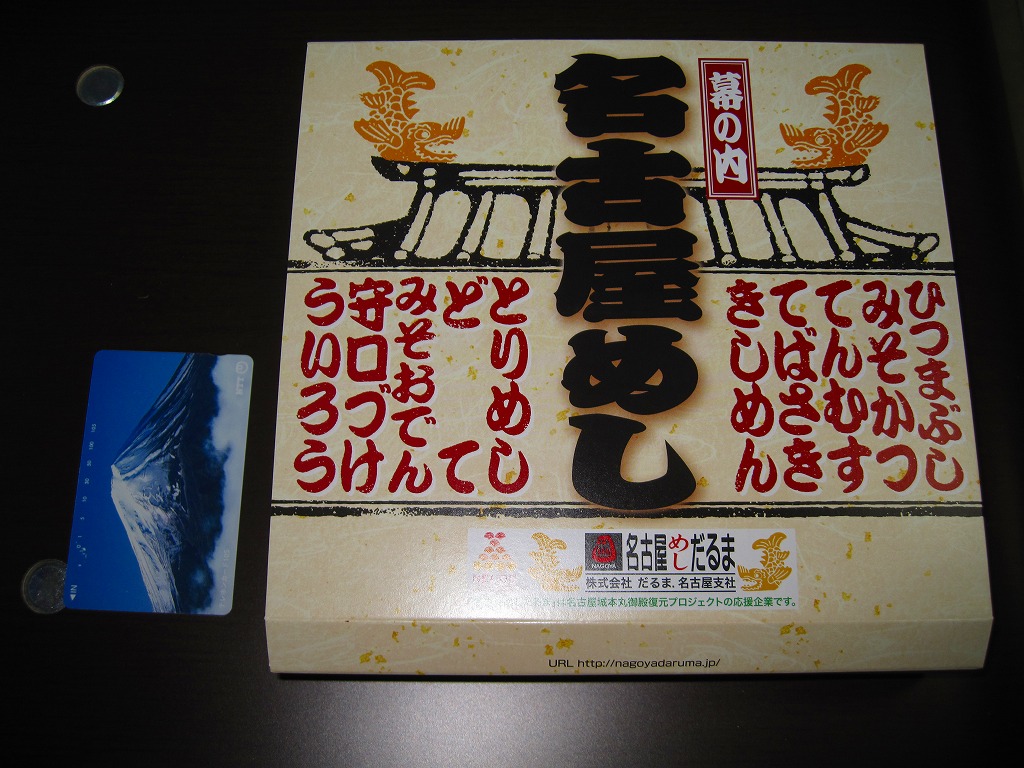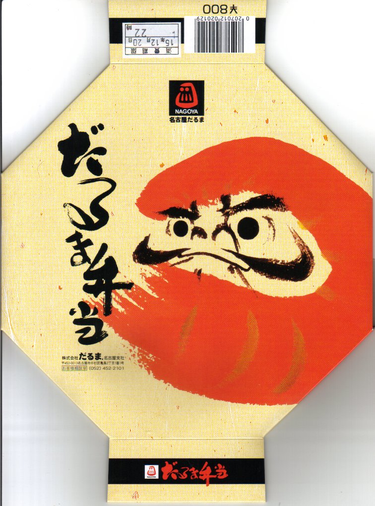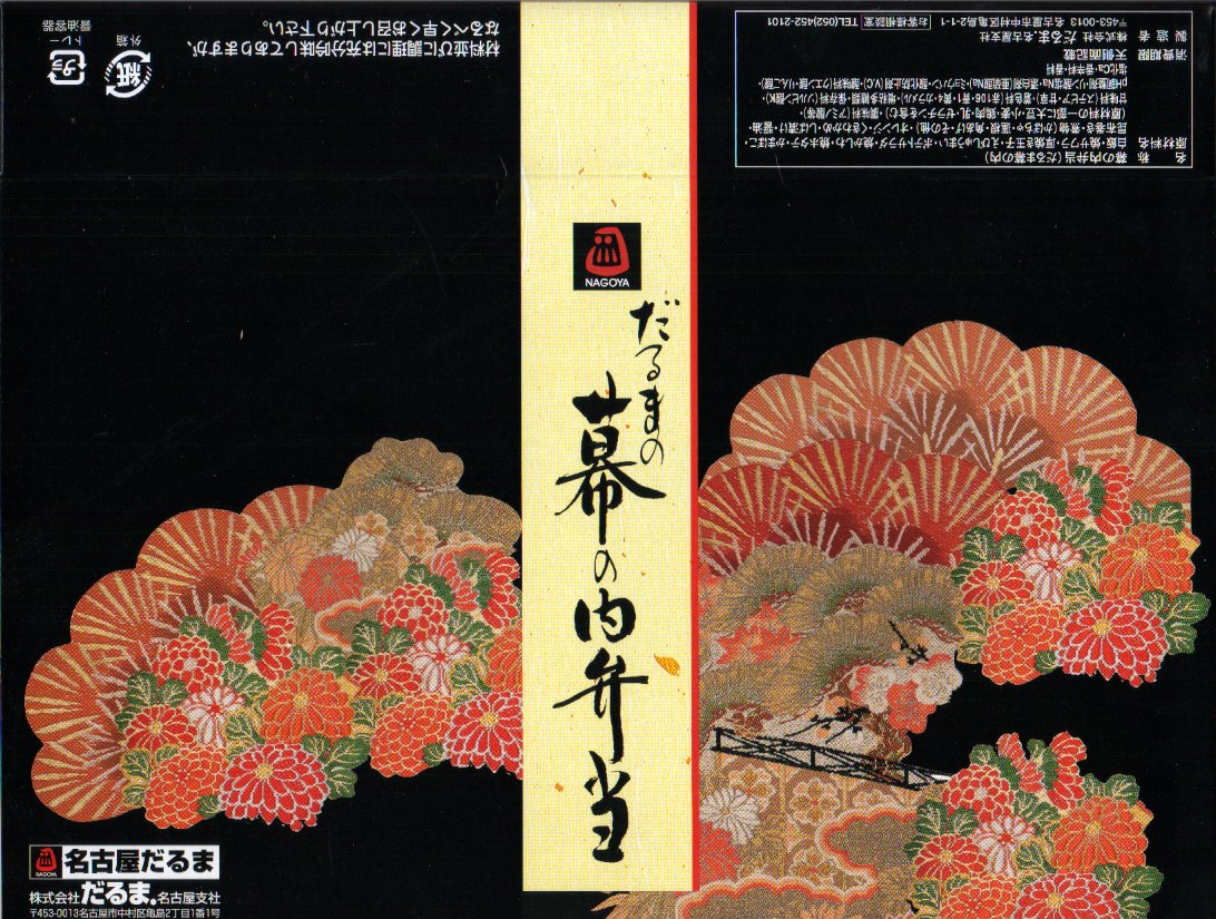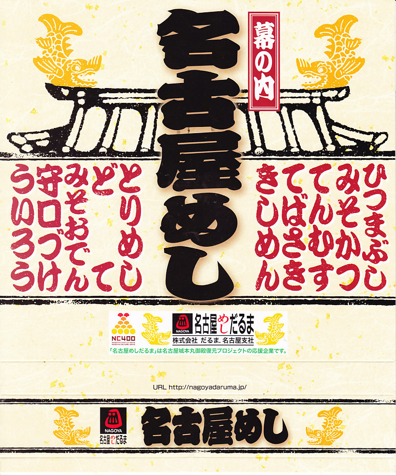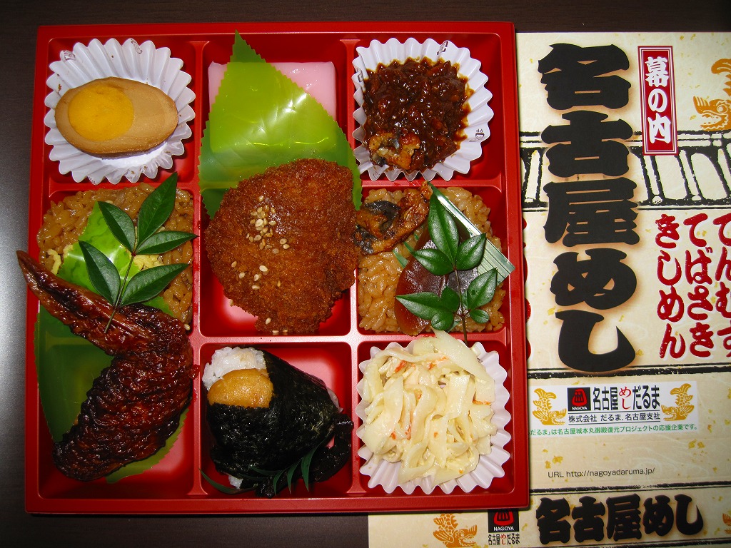 名古屋駅の幕の内弁当のだるま版。市販の仕出し弁当向け容器と同じく、ボール紙の箱にプラ製トレーを収める構造を持つが、黒と華でできた箱の絵柄に高級感があり、真っ黒なプラ製トレーもこれにリンクする。中身は正に幕の内駅弁。俵飯に鰆の焼き魚と身厚な蒲鉾と金色の玉子焼、海老焼売に鶏照焼に帆立や各種煮物、ポテトフライに茎わかめにデザートにはオレンジという内容で、地域色はないが実力のある駅弁。名古屋の駅弁にはみそカツや鶏の他にも具の種類が多いという特徴があるので、その点では名古屋を表現しているか。現存しない模様。