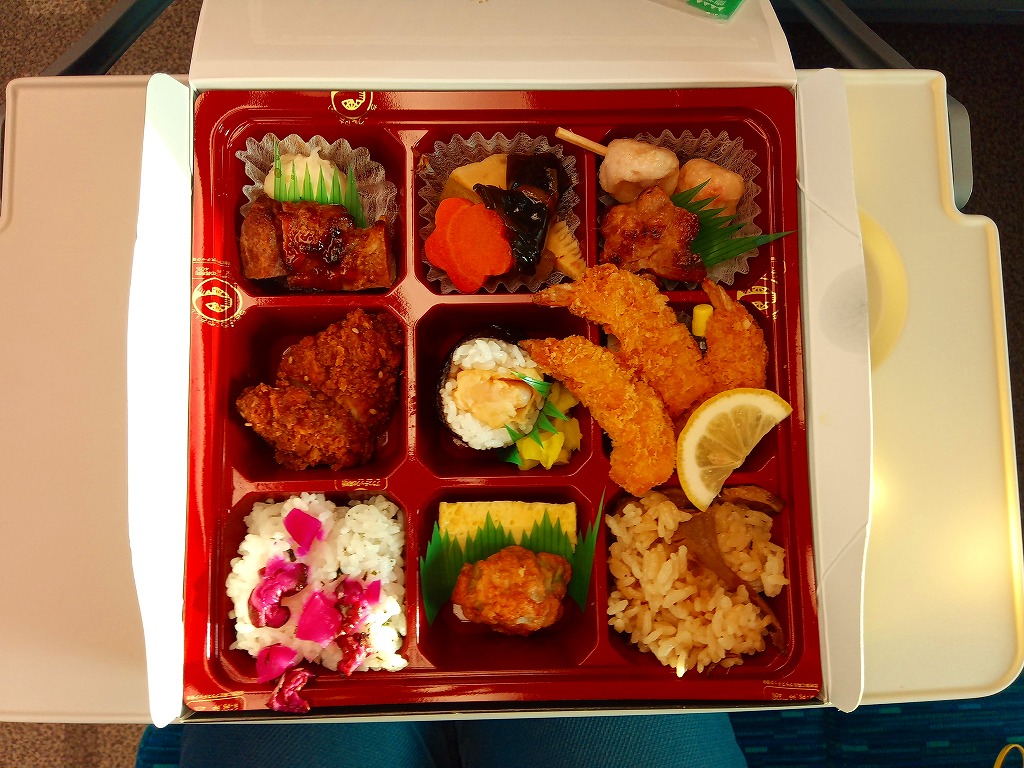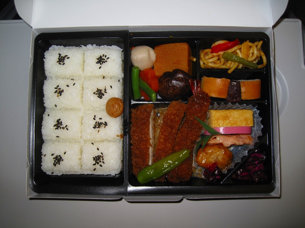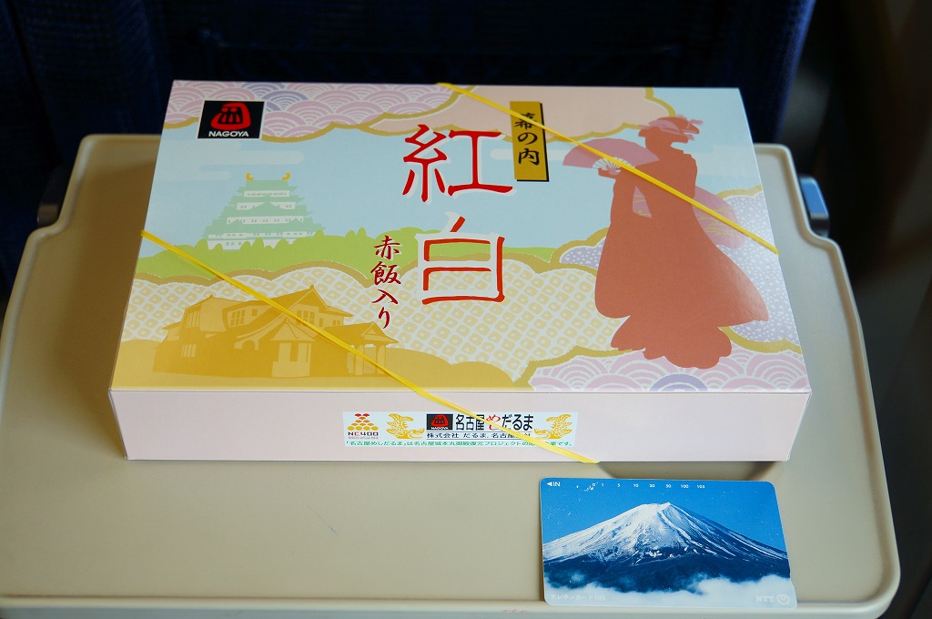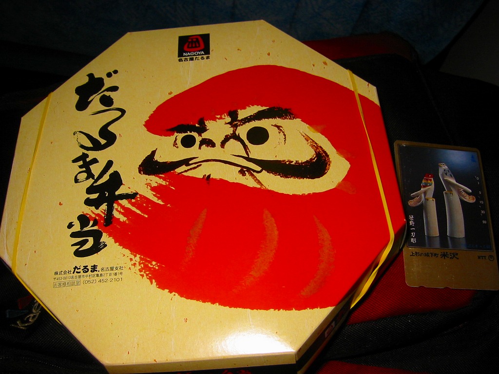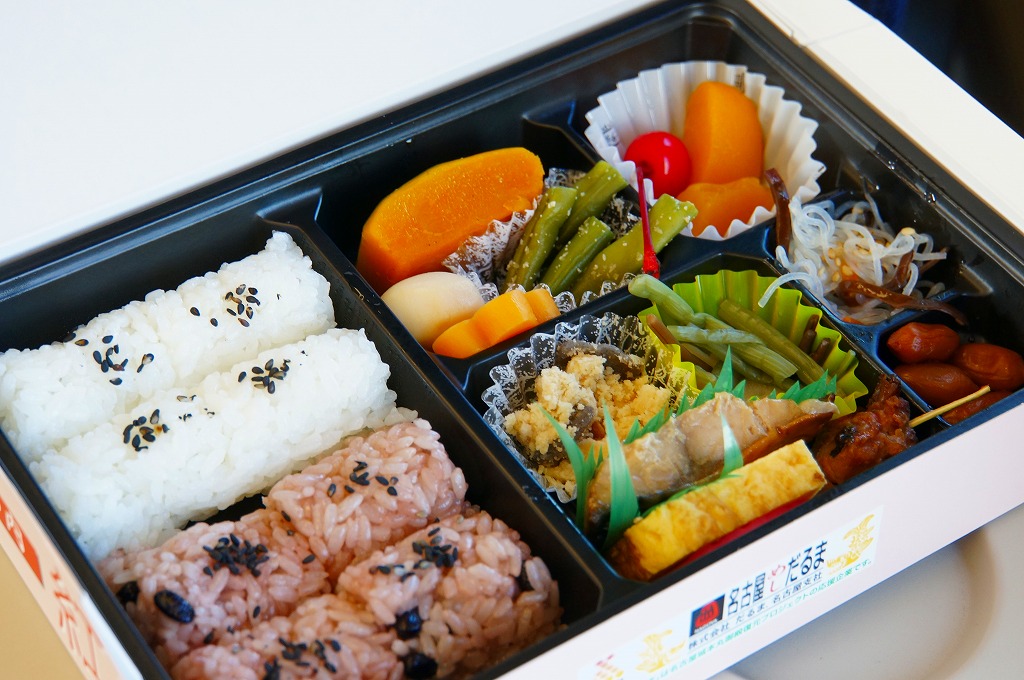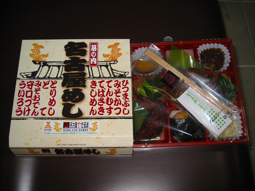 名古屋駅の幕の内弁当のだるま版。市販の仕出し弁当向け容器と同じく、ボール紙の箱にプラ製トレーを収める構造を持つが、黒と華でできた箱の絵柄に高級感があり、真っ黒なプラ製トレーもこれにリンクする。中身は正に幕の内駅弁。俵飯に鰆の焼き魚と身厚な蒲鉾と金色の玉子焼、海老焼売に鶏照焼に帆立や各種煮物、ポテトフライに茎わかめにデザートにはオレンジという内容で、地域色はないが実力のある駅弁。名古屋の駅弁にはみそカツや鶏の他にも具の種類が多いという特徴があるので、その点では名古屋を表現しているか。現存しない模様。