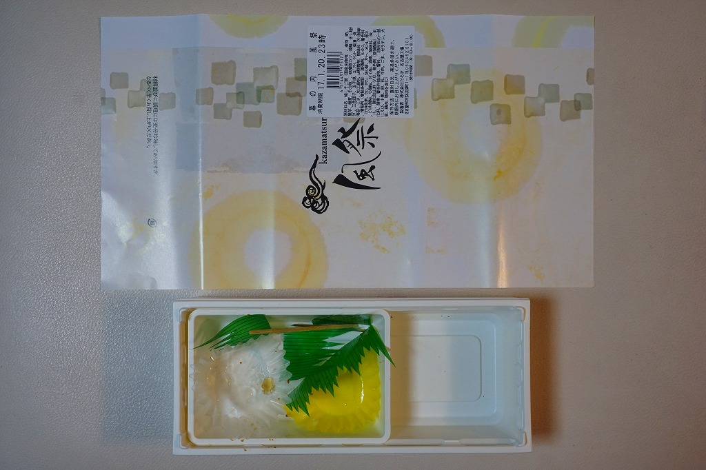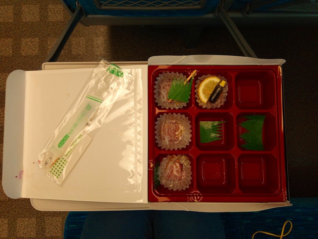 「幕の内昭和」と何が違うのかと思って公式サイトを見ると、揚げ物のない幕の内弁当という位置付けだそうな。元日に購入したため、この日や時期のために目出度い駅弁を売っているのかと思ったら、そうではなく一年中この名前と姿で買える模様。価格は2013年の購入時で750円、2016年時点で770円、2020年時点で864円。どうもこれは、駅で売られる商品でなく、調製元の仕出し弁当として配送される商品である模様。