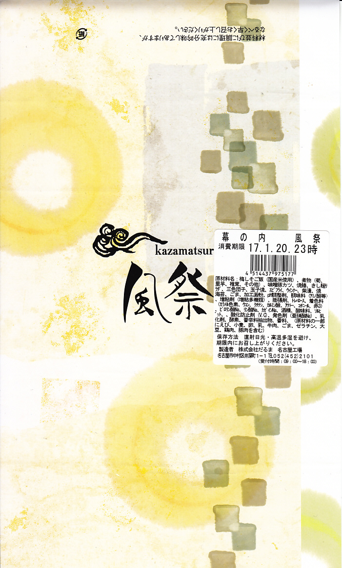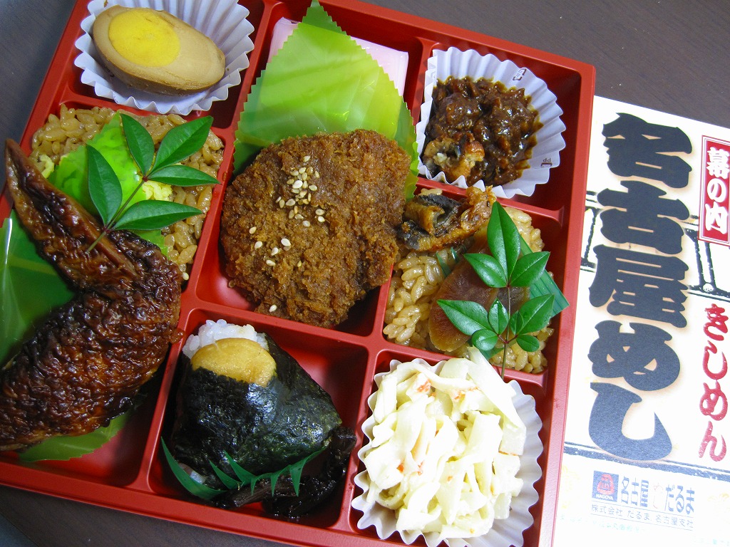 2007(平成19)年6月の新作だそうな。9区画の正方形のプラ製容器を、中身と駅弁の名前を賑やかに描いたボール紙の枠にはめる。中身はひつまぶしことウナギの小片を載せたタレ御飯と、錦糸卵を載せたとりめし、天むす、みそかつ、手羽先、きしめんサラダ、みそおでんこと煮玉子、どて、ういろう、守口漬。これのどこが「幕の内」なのかと思うが、見た目で確かな名古屋ないし愛知。よそ者には厳しい味や食べ方についても容赦ない。2013年頃までの販売か。
